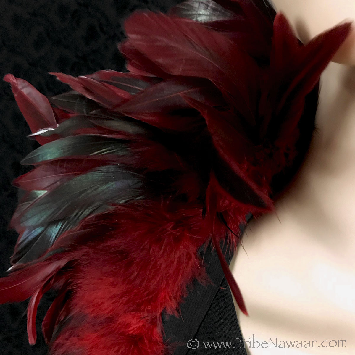 Tribe Nawaar's rich red premium theatrical feather collar, detail of feathers