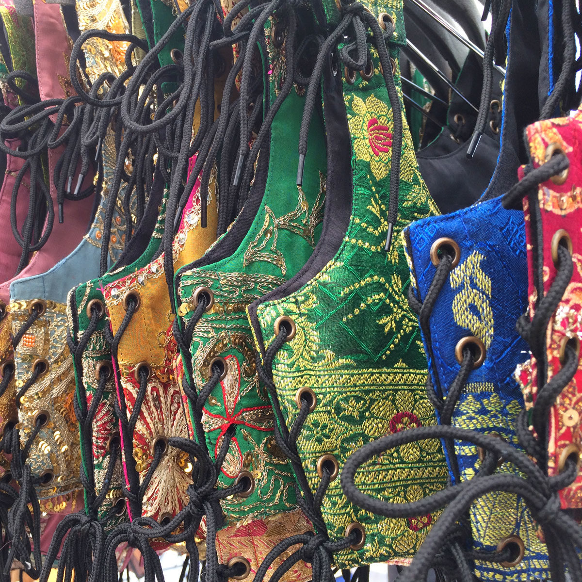 Assembled with gorgeous new & vintage fabrics, these eco-chic pieces feature corset-like grommets that adjust to comfortably fit most body shapes!