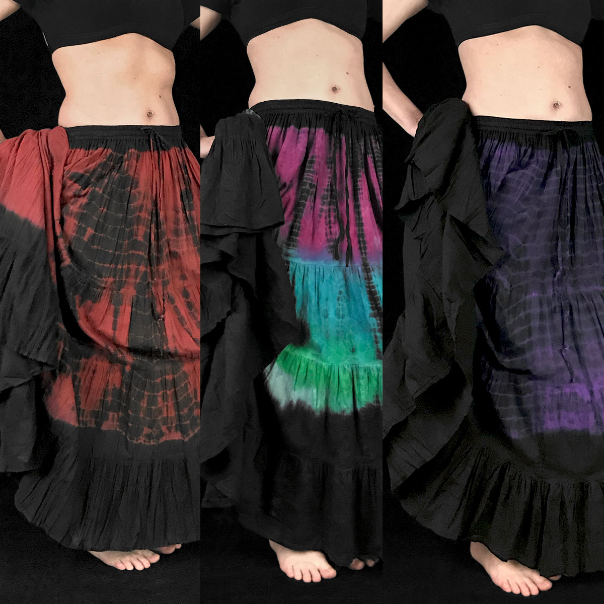 Choose from our new 25 yard multicolored tie dyed skirt ..or the super affordable economy style tie dyed skirt options! Prices start at $39