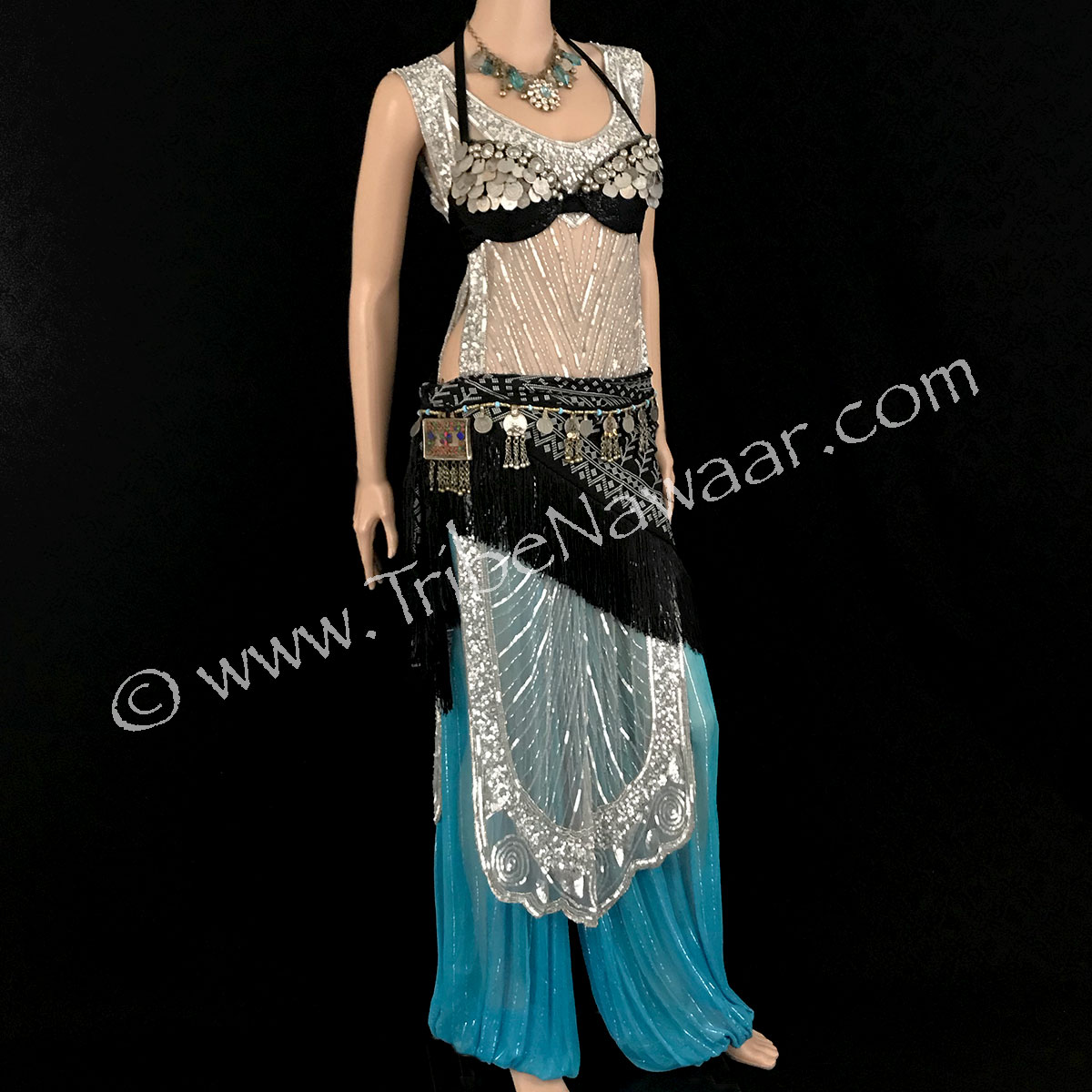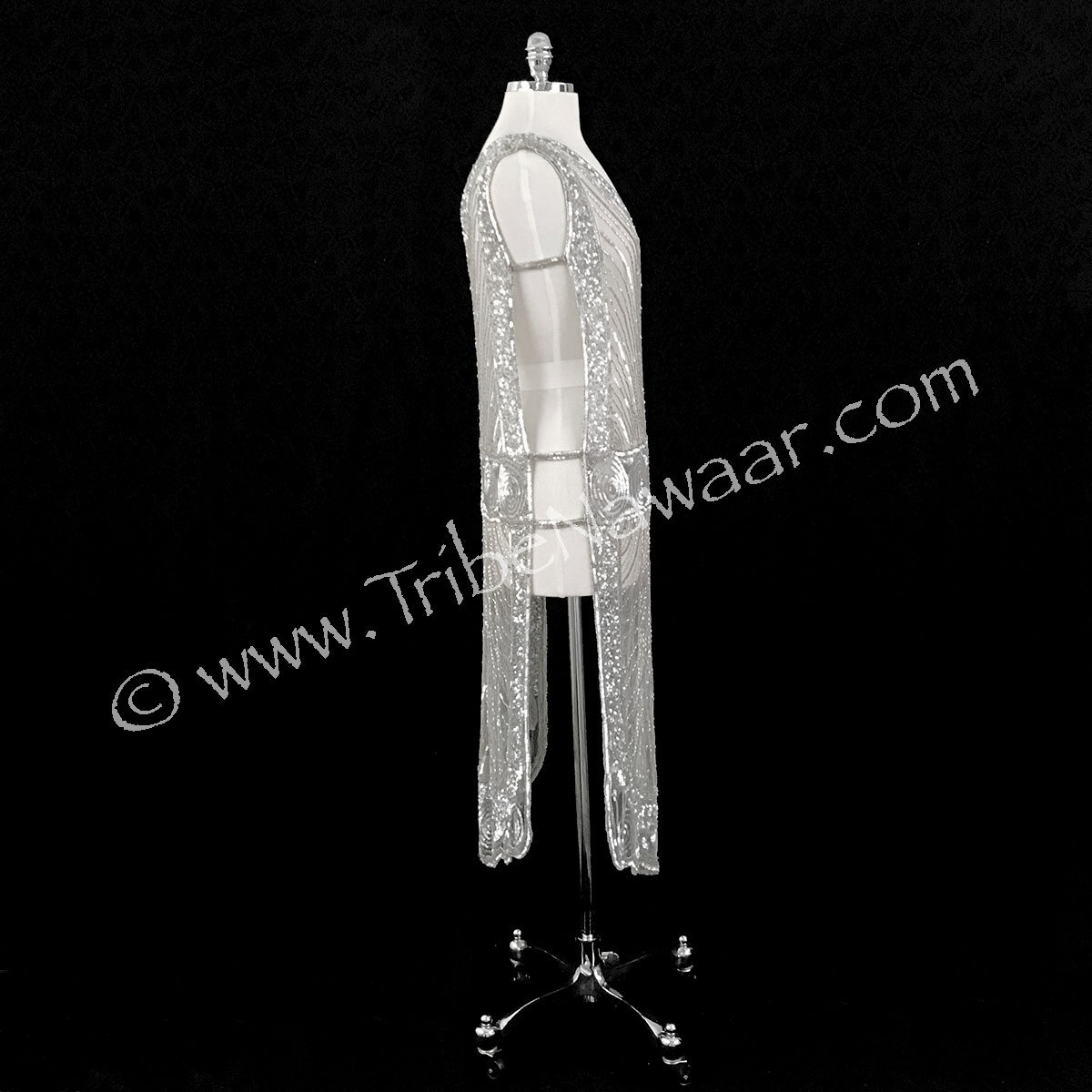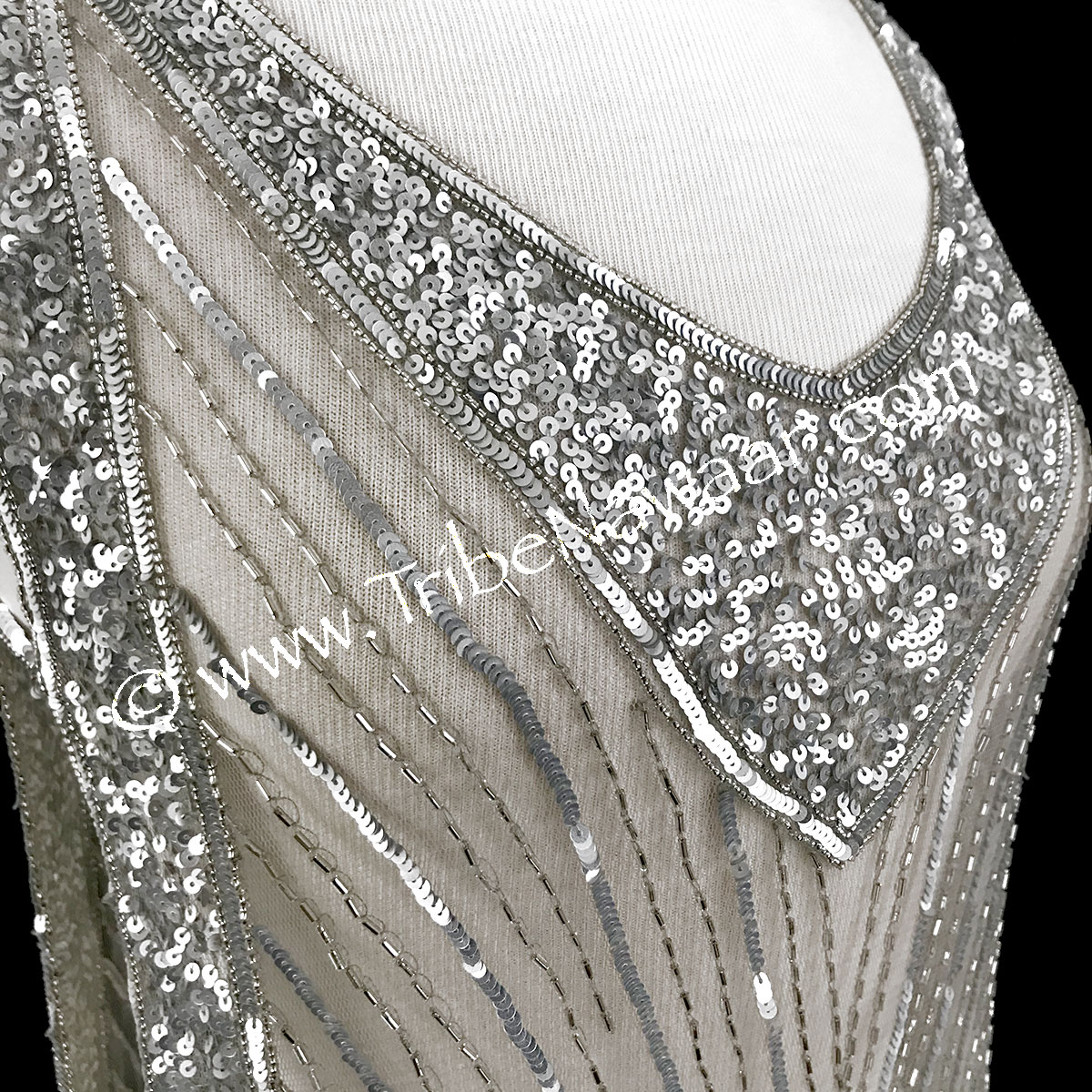 Panels are attached at the shoulders and linked by 2 sequined bands along the sides. High quality black mesh fabric. Hand sewn beading and sequin detailing. Designed by Deco Haus in Hollywood, lovingly brought to you by your friends at Tribe Nawaar.