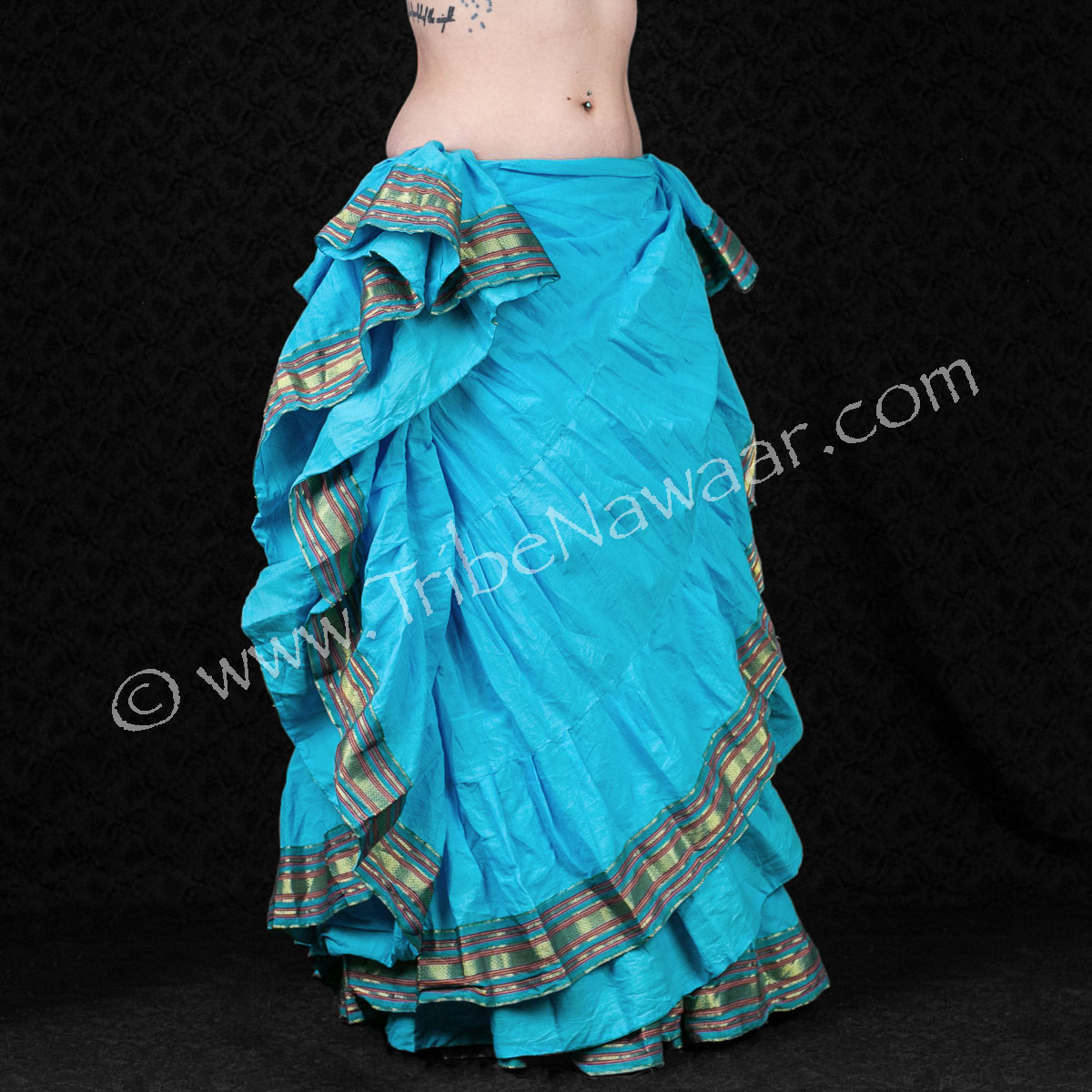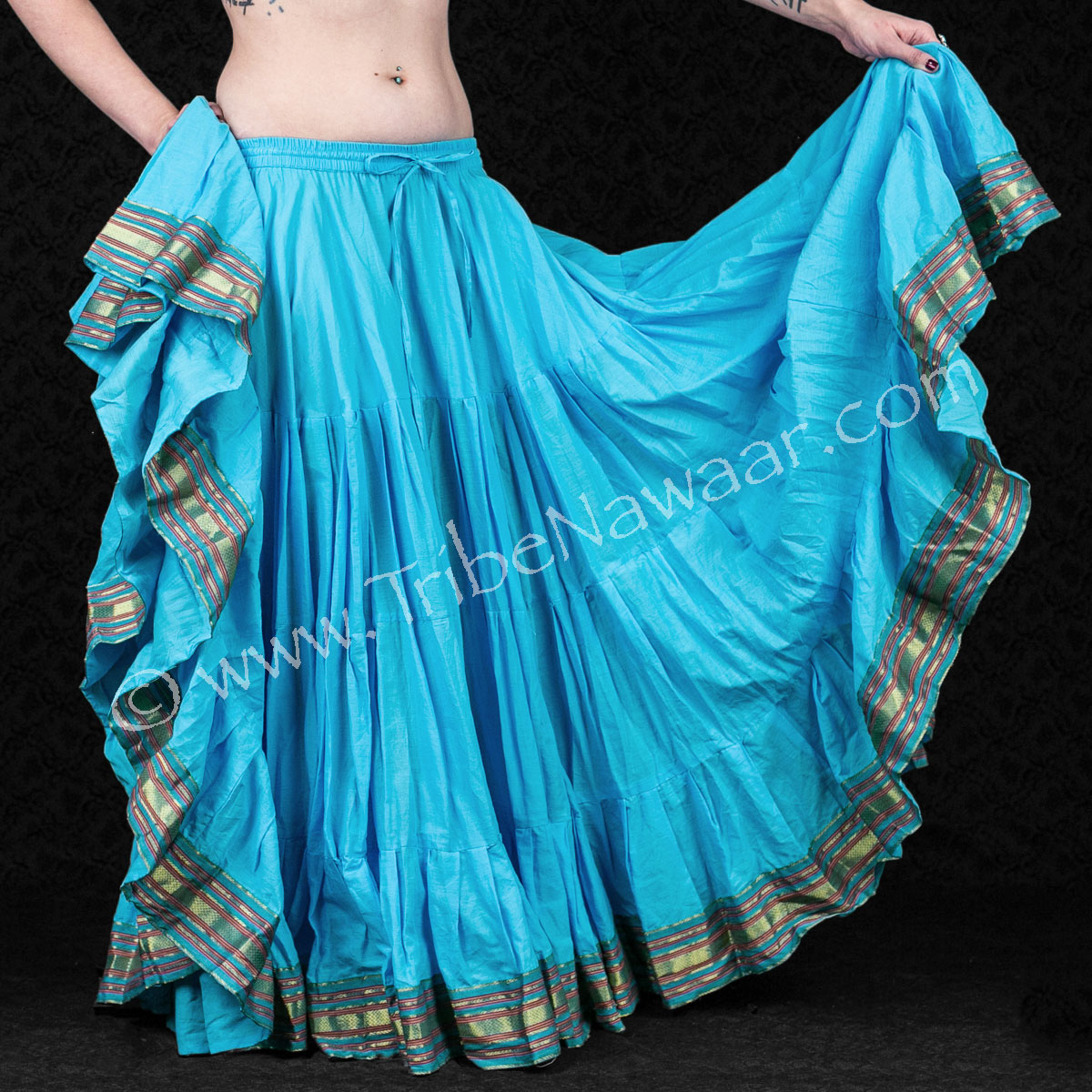 AHHHHH I absolutely adore this one! The blue is so vibrant, it contrasts well with other colors, and on stage, it’s magnetic! It’s more lightweight than the more basic 25-yeard cupcake skirt, but it has just as much range and flow. That sari trim is such a nice touch that completes the look together, especially when tucked across. I love this skirt. I will never give it up.