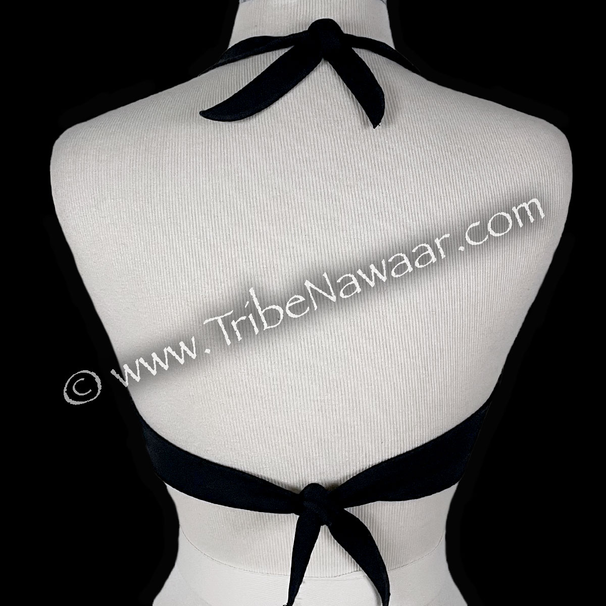 Black lingerie bra base. Sturdy halter style ties showcase an open back. Features an opulent mix of coins. Smooth domical buttons adorn the bust line. Vintage Kuchi chain & drops accent the center. You can add an additional center pendant, if desired.
