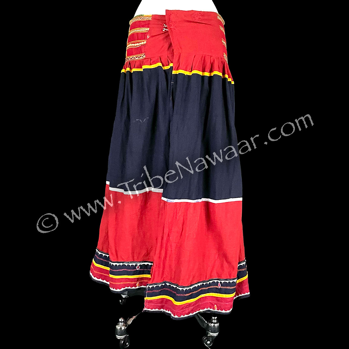 Sturdy cotton in multiple tiers. Red and dark navy blue are the featured colors. Wrap style skirt closes with oversized snaps and fabric wrapped hooks & eye.