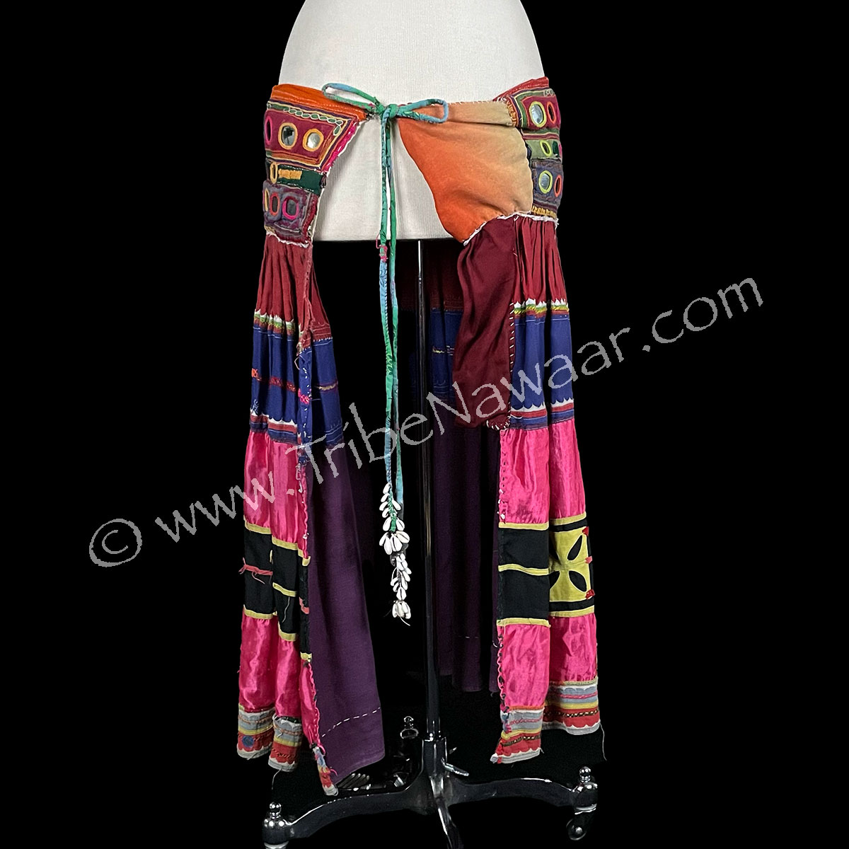 Sturdy cotton in multiple tiers. Red, indigo blue, pink and black are the featured colors. Wrap style means it will fit a variety of sizes. Long green ties with cowrie shell ends. Adorned with embroidery and ‘shisha’ mirrors. Additional peach and burgundy fabric tacked to front to add length- can be removed, if desired. Top belt section is very slightly padded for a comfortable fit.