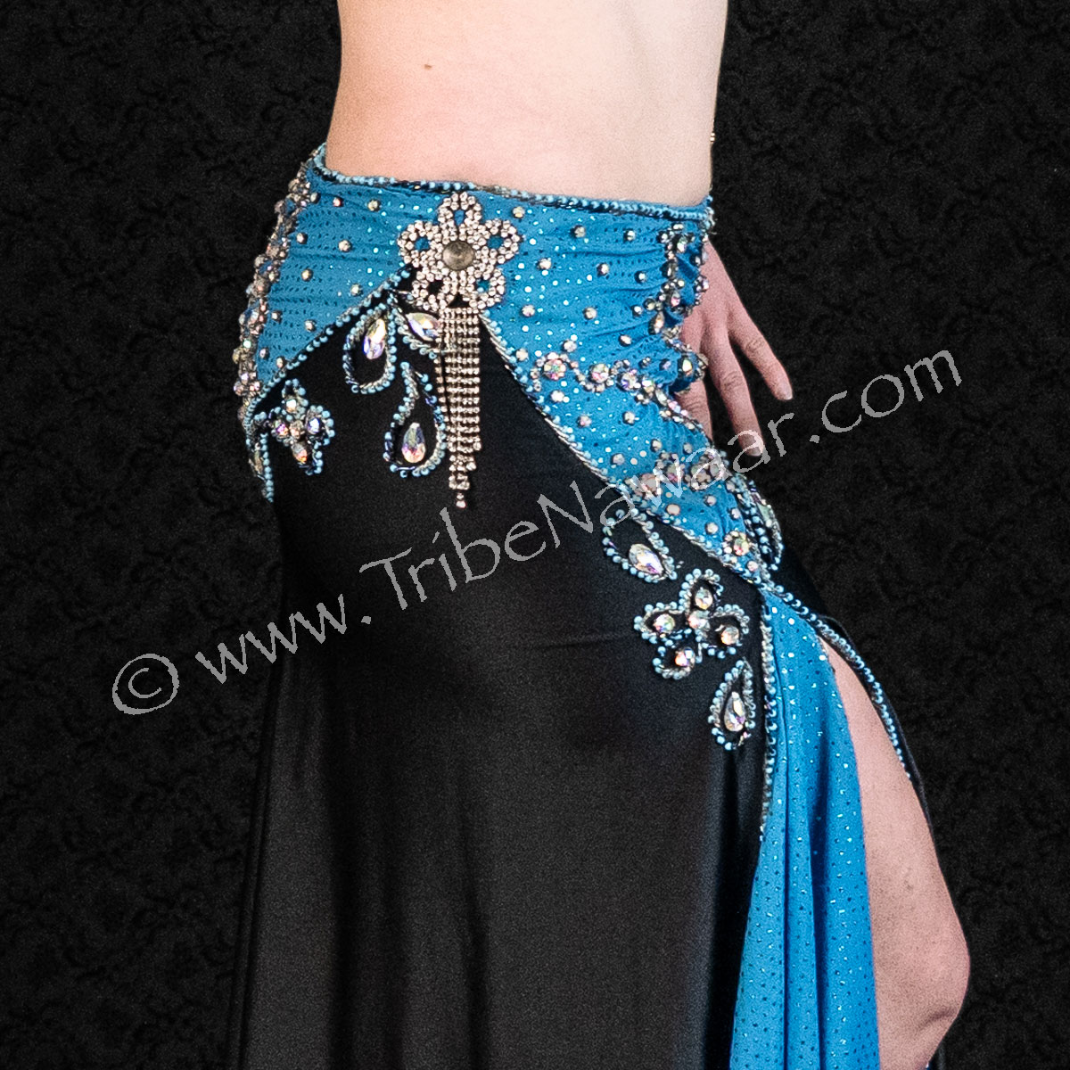 This flattering Black & Blue Bra & Skirt is ready for your next performance! Rhinestone accents really pop under stage and natural lighting!