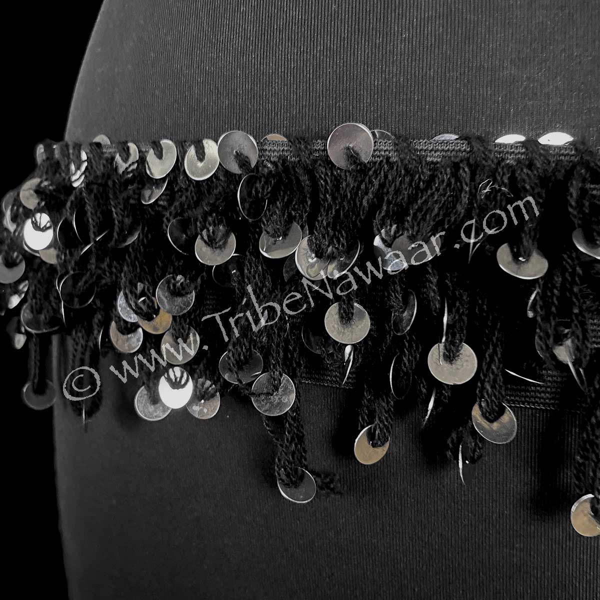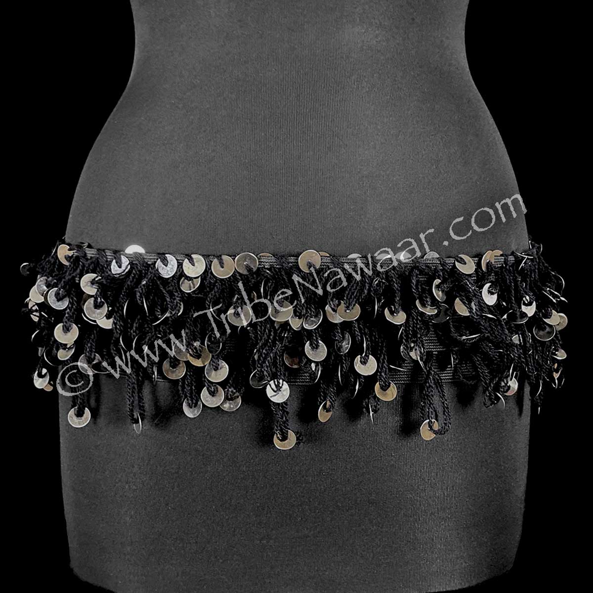 This Black Mozuna Belt from Morocco is assembled on a wide black elastic base that hugs curves nicely. Black yarn falls with silver discs accentuate dance and make a delicate sound with movement. Heavy duty hooks and eyes keep the belt in place.