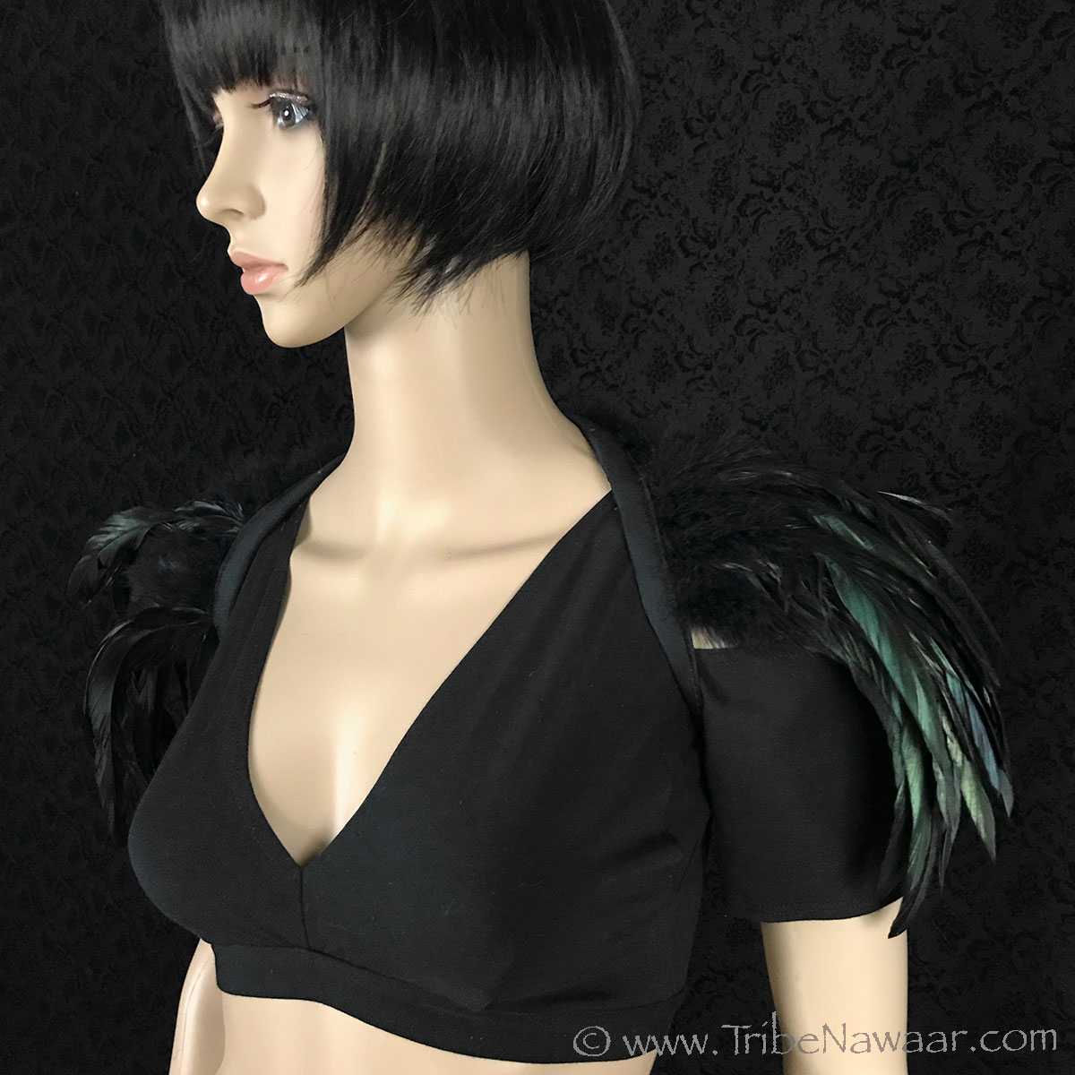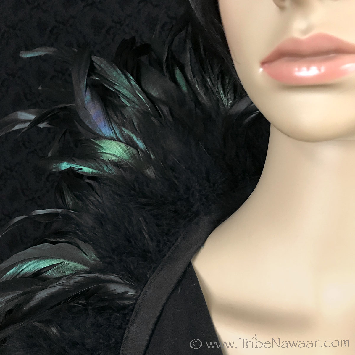 Made using a stretchy and comfortable fabric base. We sew in rich black coque feathers to create our decadent collars. Iridescent black on the tips of the feathers are dramatic on stage or off! The feathers are so soft and the base fabric is so comfortable you might forget you are wearing it!
