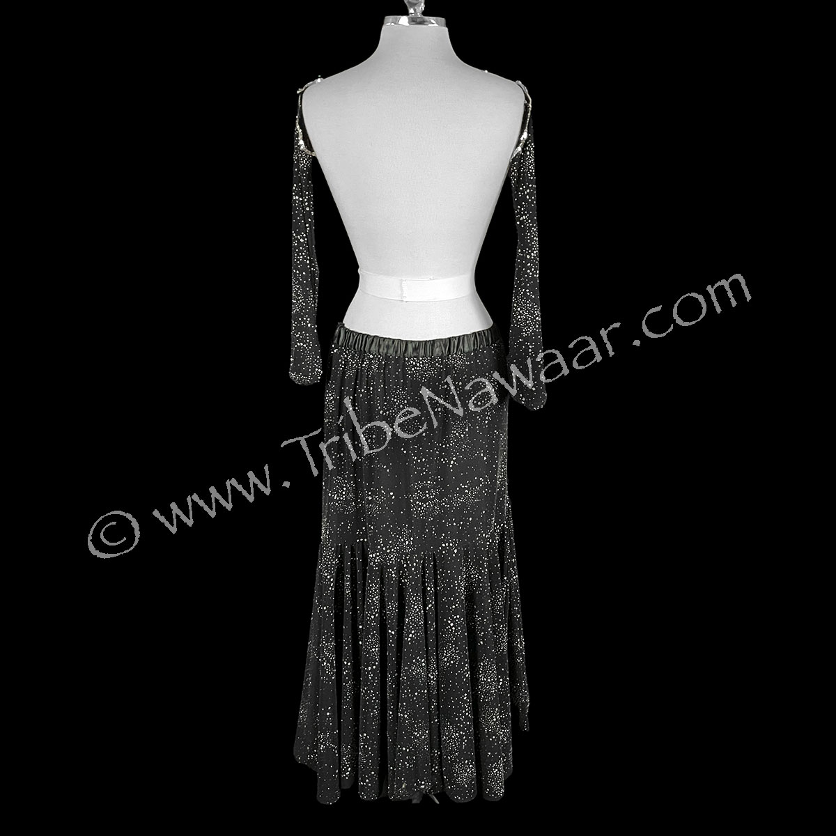 This Black & Silver Galaxy Skirt & Gauntlet Set is ready to sparkle at your next event! Would work with a variety of dance genres and complement a variety of colors.