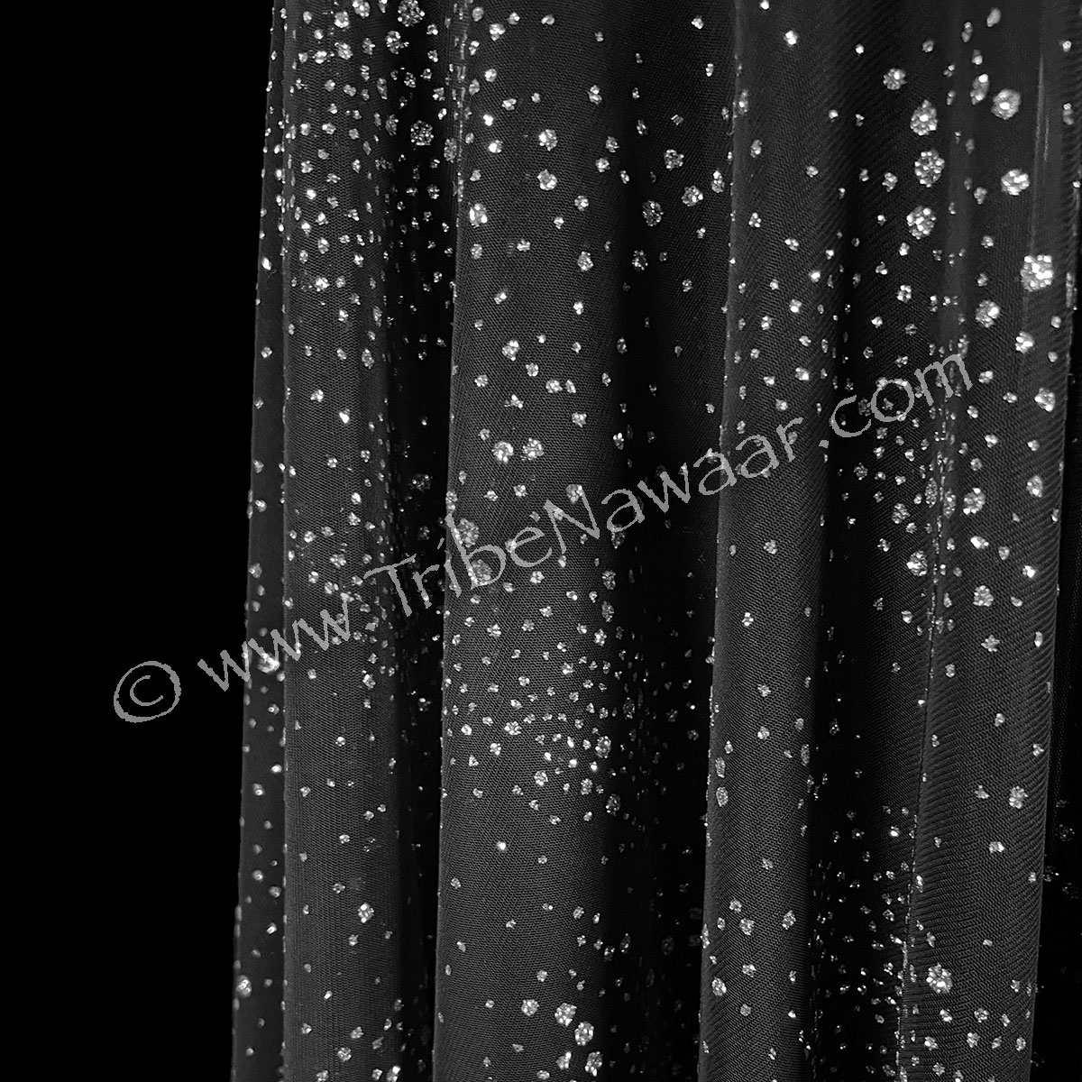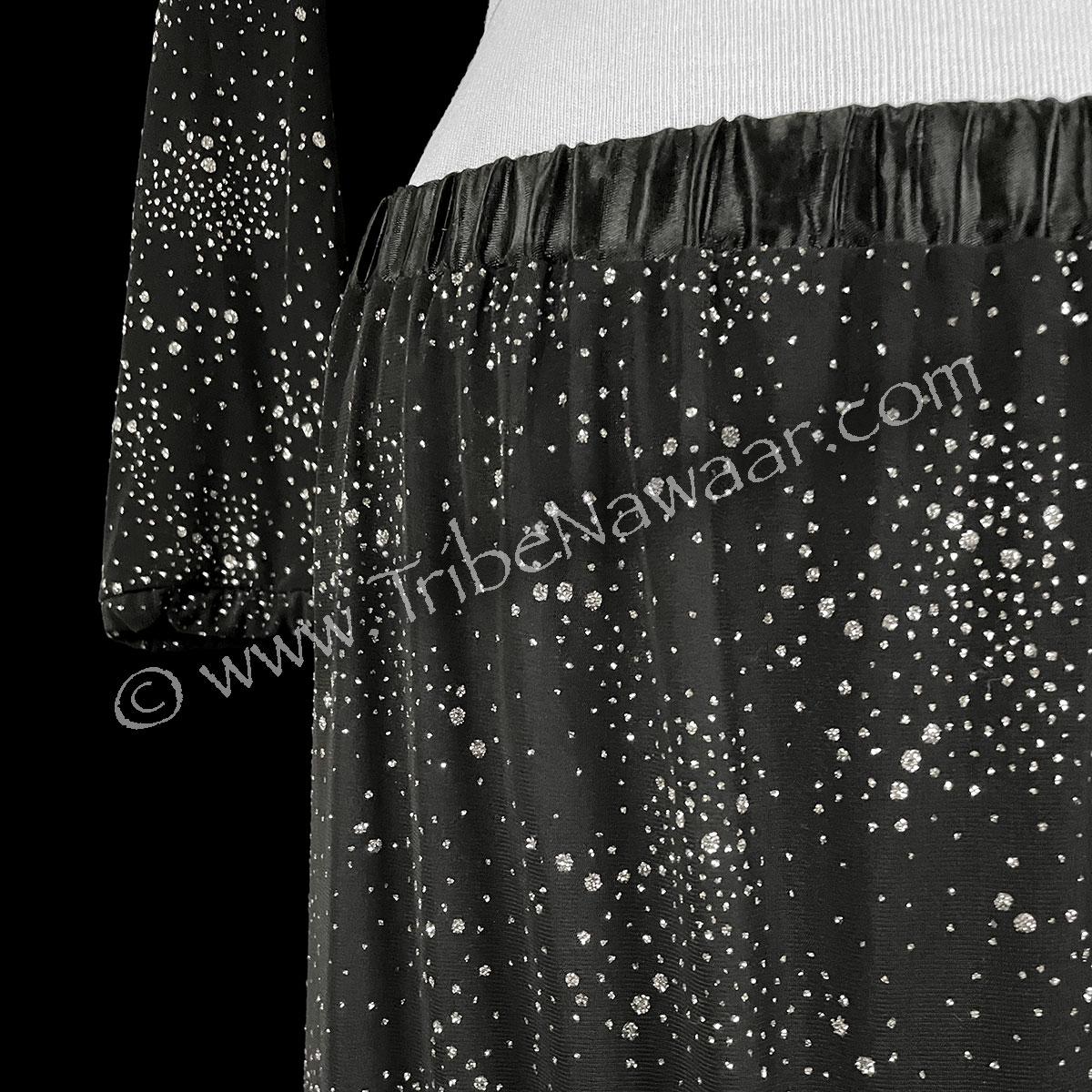 Slightly sheer black fabric (unknown fabric content/no tags) with silver glitter sparkles. Skirt has a double layer at top tier for modesty & elastic waistband.