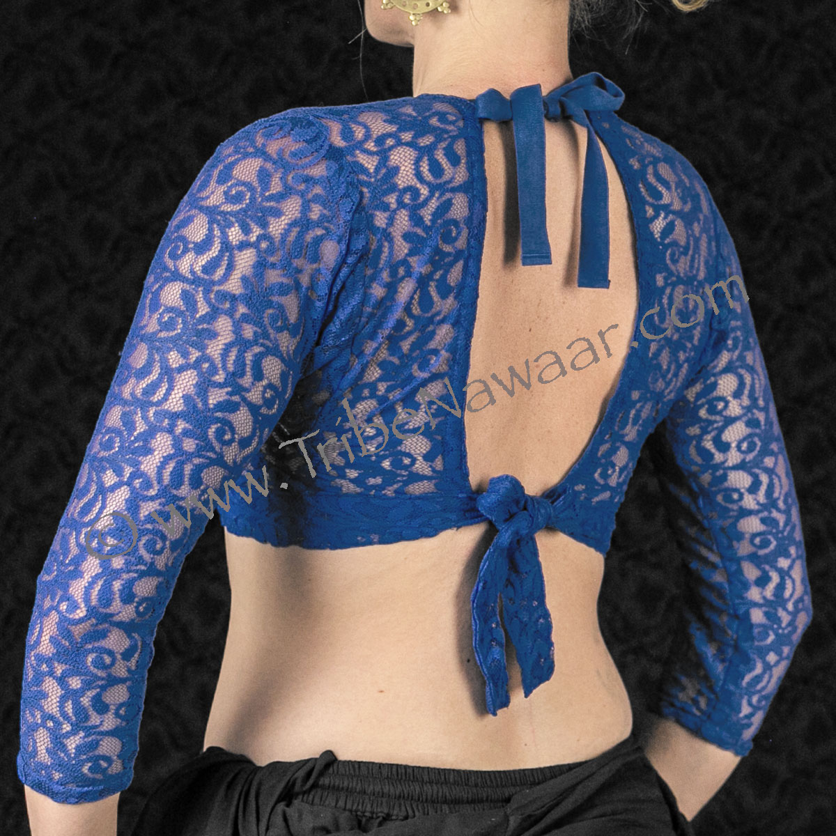 Our blue lace choli top is a favorite among belly dancers. Sheer style lace pattern shows up beautifully against all skin tones. 3/4 sleeves design made with 4 way stretch lace provide comfort and full flexibility for all dance forms.