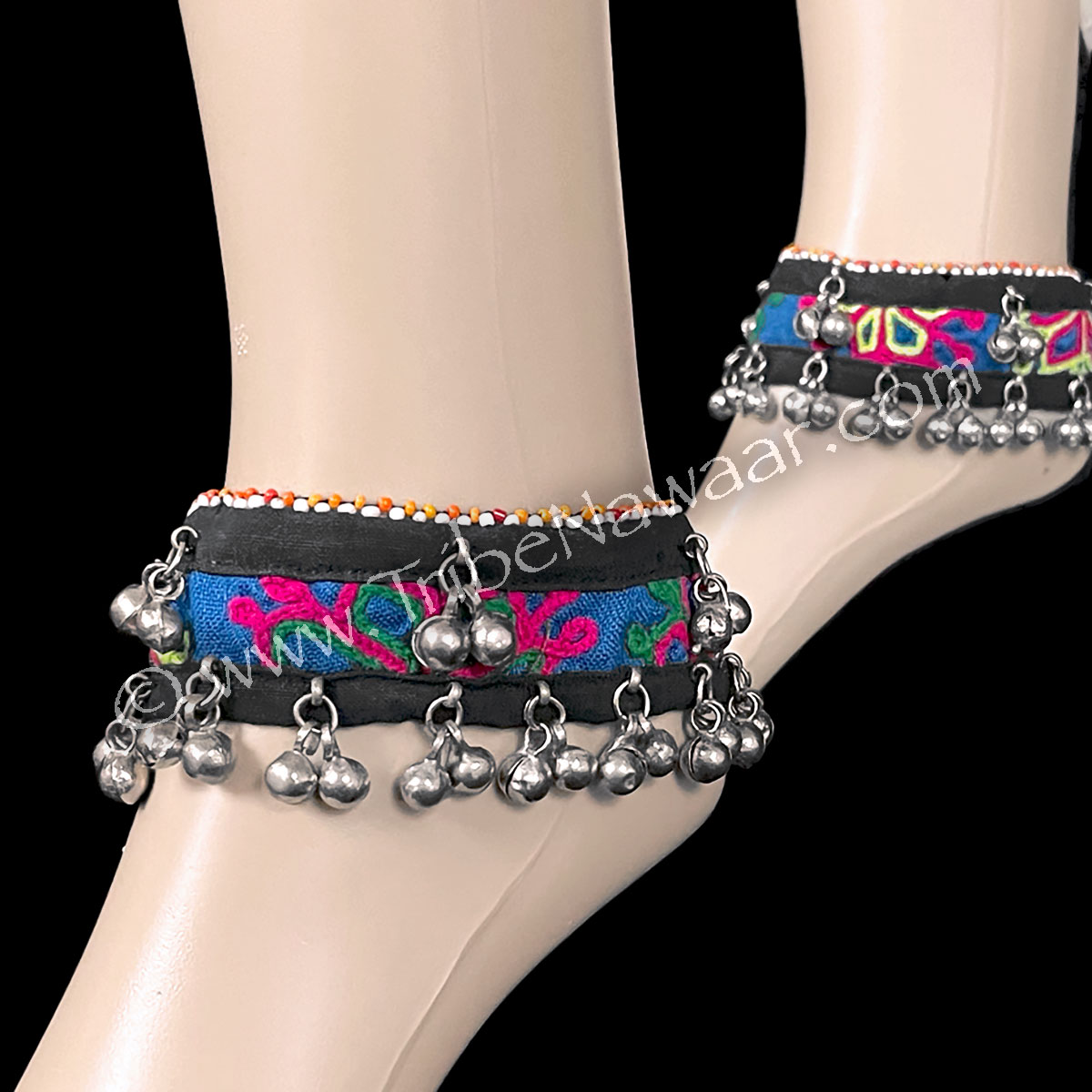 Our Blue Lotus Traditional Gota Anklets feature a blue vintage Gota band with fuchsia, green and yellow accents. Silver bells on top and bottom edge. Attached to a sturdy black cotton base these anklets are comfortable to wear, as well! Small white and orange beads accent the top edge… or wear them upside down (with the larger amount of bells at the top) for a different look! The bells will cover the Gota base and give more of an all silver look to these anklets!