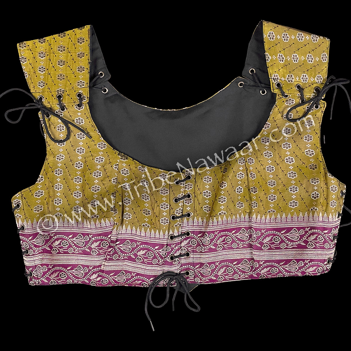 Our premium vintage sari fabric content is typically about 70% silk, 30% viscose. These up-cycled fabrics are cleaned, pressed and custom tailored into our fabulous one of a kind bodices. We’ve added a sturdy new lining to the inside of the bodice for maximum durability. Includes a bonus black lace tie just in case you loose one.