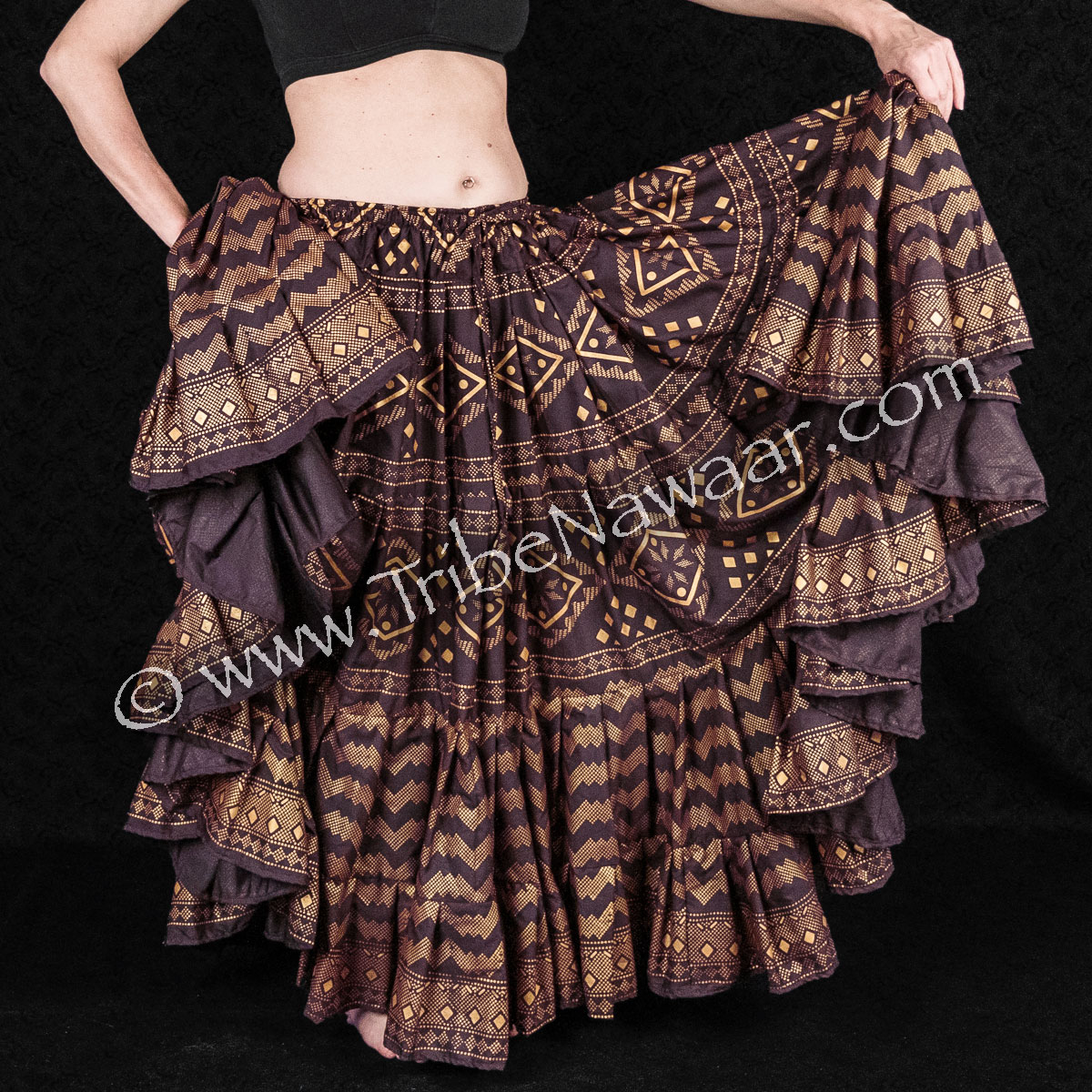 Our Cocoa Brown & Gold Assuit Skirt features multiple tiers of decadent block printed fabric. You can see the original stamping of the block print process in the slight variations within each pattern. A true work of art!