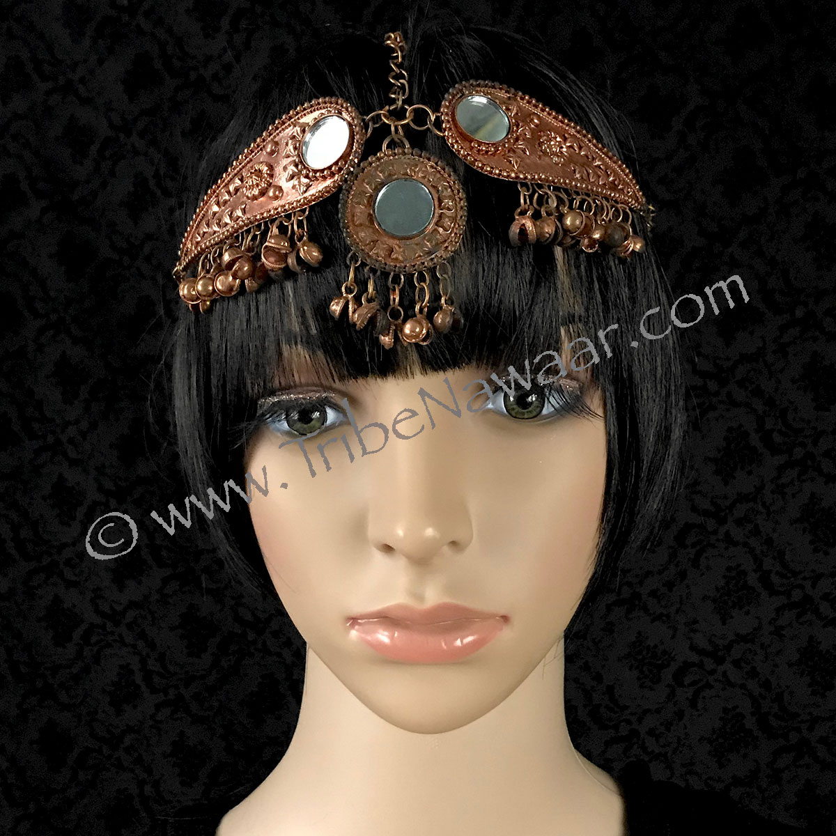 This head piece is a great accent to many ensembles.  It features a copper toned finish with 3 round shisha mirror accents and an antique patina varnish.  Hand antiquing method allows for each piece to have it’s own unique vintage look.