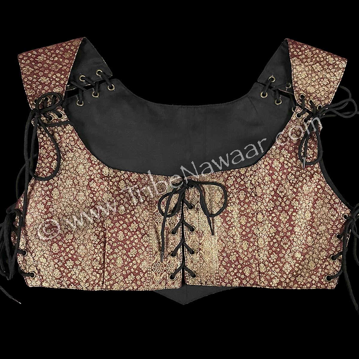 Eco-chic and environmentally-friendly, our Copper Shift bodice is newly constructed and assembled with vintage sari fabric. The inside is lined with sturdy new black cotton fabric. Gold and red iridescent fabric gives an overall copper look to this bodice.