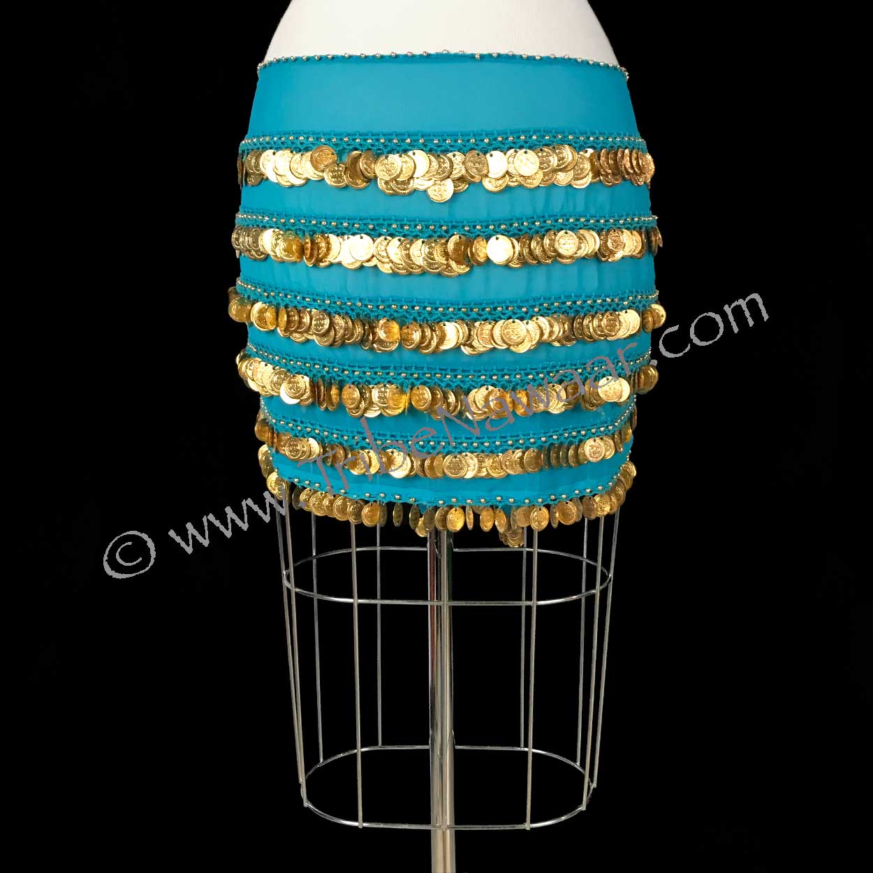 Our deluxe turquoise & gold coin hip scarf is the quintessential coined belly dancer hip scarf. Use to create a classic raq sharqi belly dance look or for blinging up a tribal costume!  Made of quality materials with lots of layers of coins! Perfect for accenting shimmies and twists!