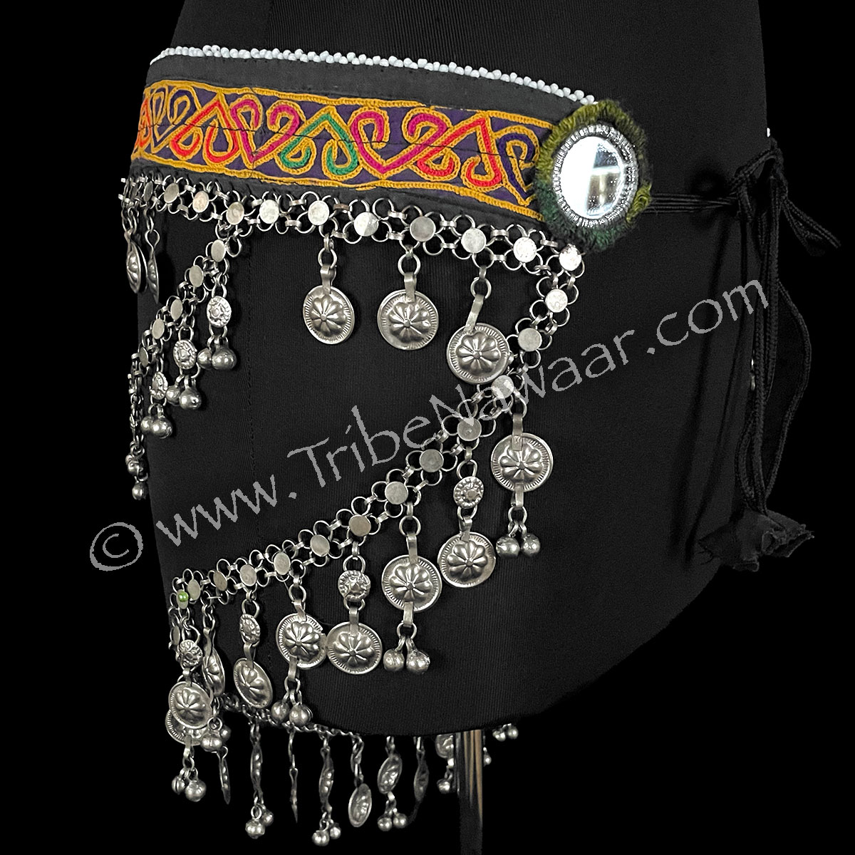 Vintage textile belt with rimmed mirrors and beads. 3 draped links with bells and flower tabs hug curves on the back. They add a melodic tone to your every hip movement.