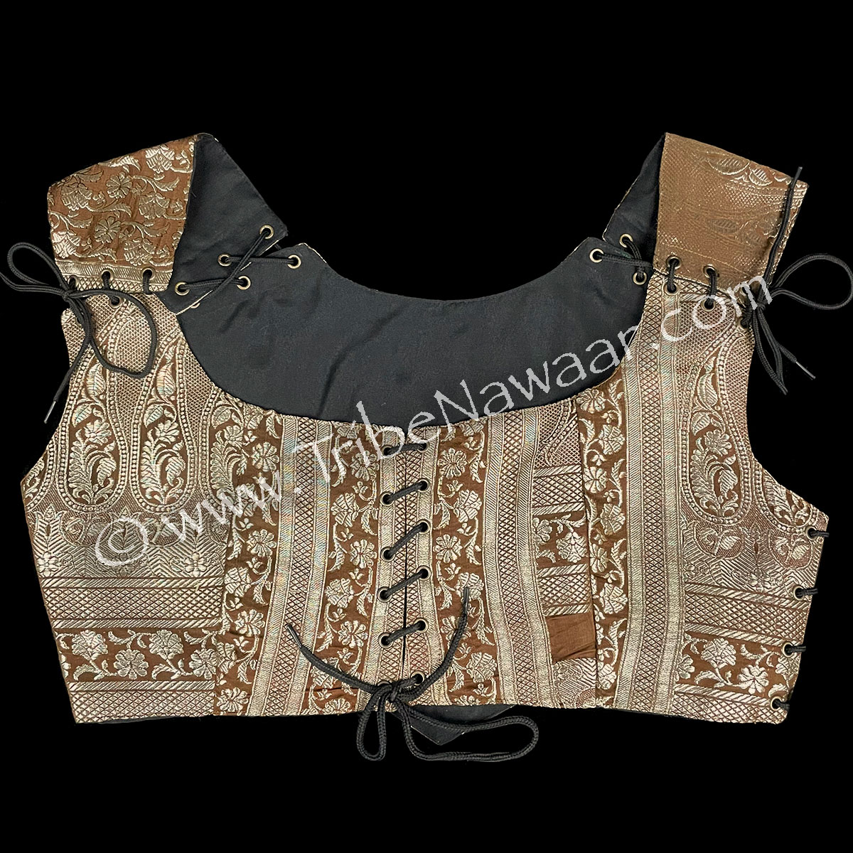 Eco-chic and environmentally-friendly, our Earthen Bronze bodice is newly constructed and assembled with vintage sari fabric in shades of warm brown. Champagne (silver-gold) accents add interest. The inside is lined with sturdy new black cotton fabric.