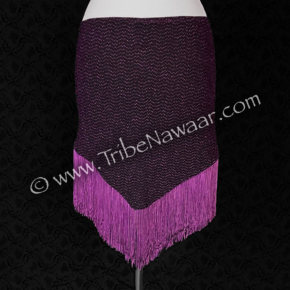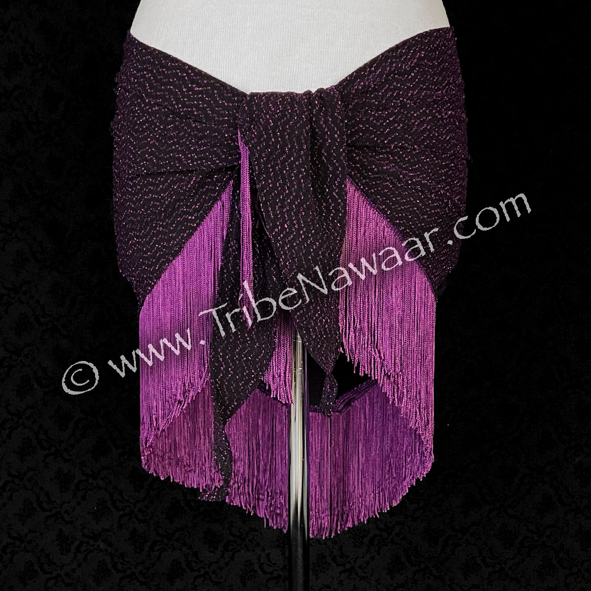 Deep black fabric base with purple shimmer in a zig zag pattern. All edges professionally finished along all edges. Ultra decadent purple fringe is the ideal weight and length to accent dance movements. Fabric is stretchy and will hug curves nicely when worn around the hips. Tie the scarf at the front or at either hip for a variety of looks.