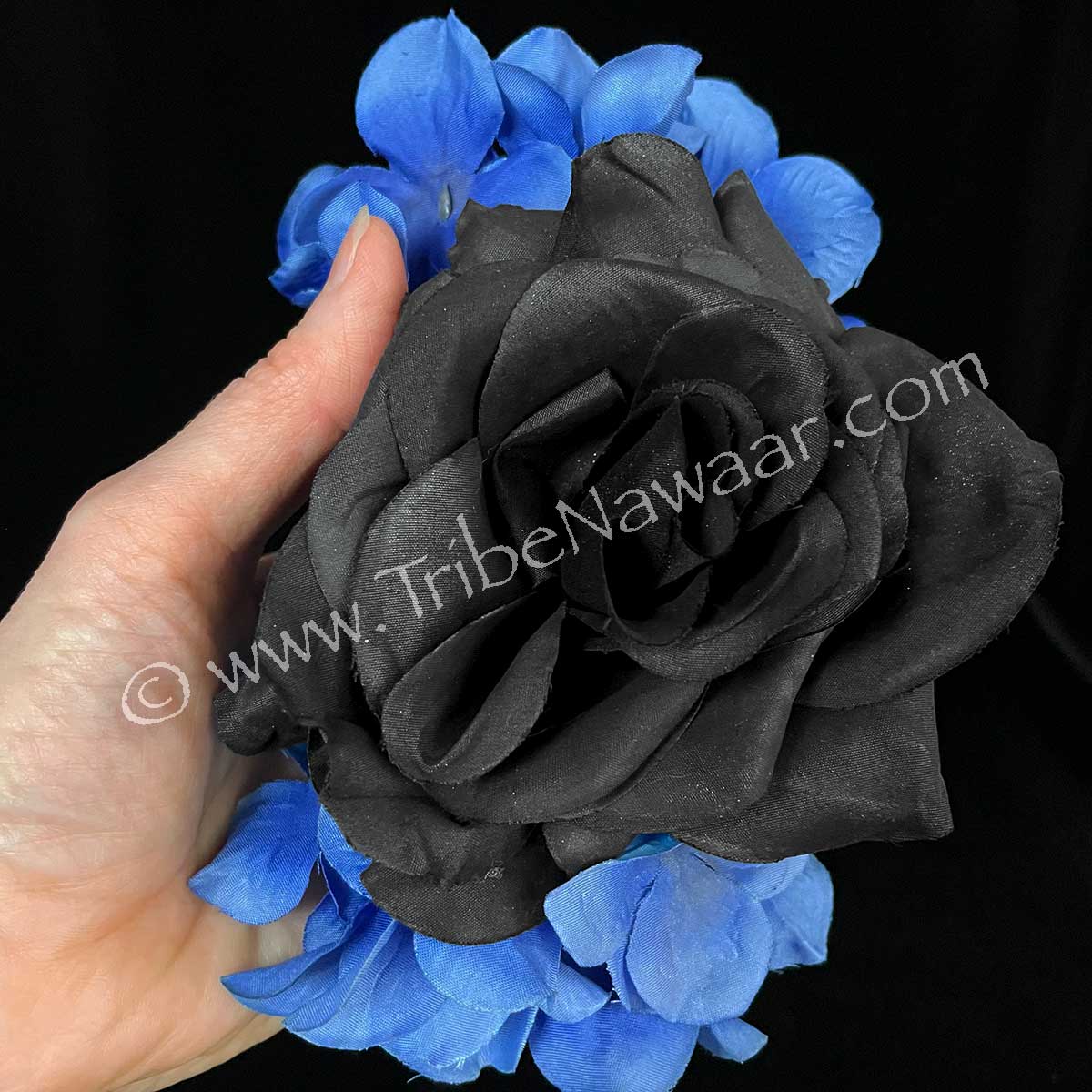 Black rose with soft cornflower blue accents on a sturdy hair clip