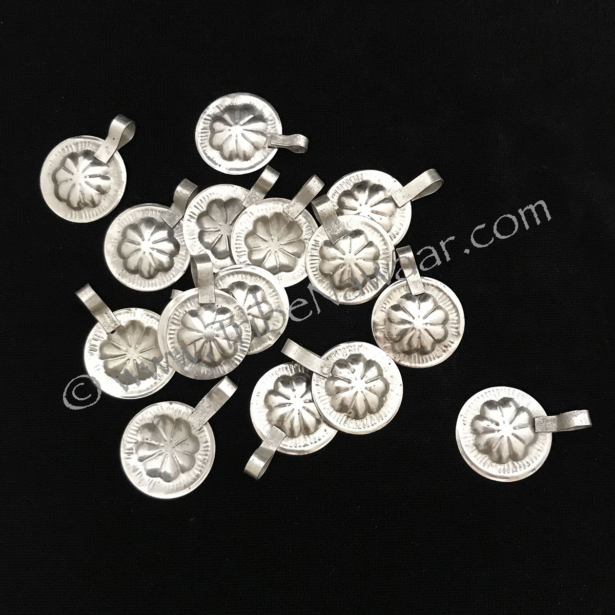 Economical pack of 15 traditional embossed flower tabs. Great for adorning all textile types including tops, skirts, cloaks, coverups, belts, headbands, armbands, and belts. Arrange them in a rows, clusters or patterns for a variety of looks. Aging and tone may vary slightly.