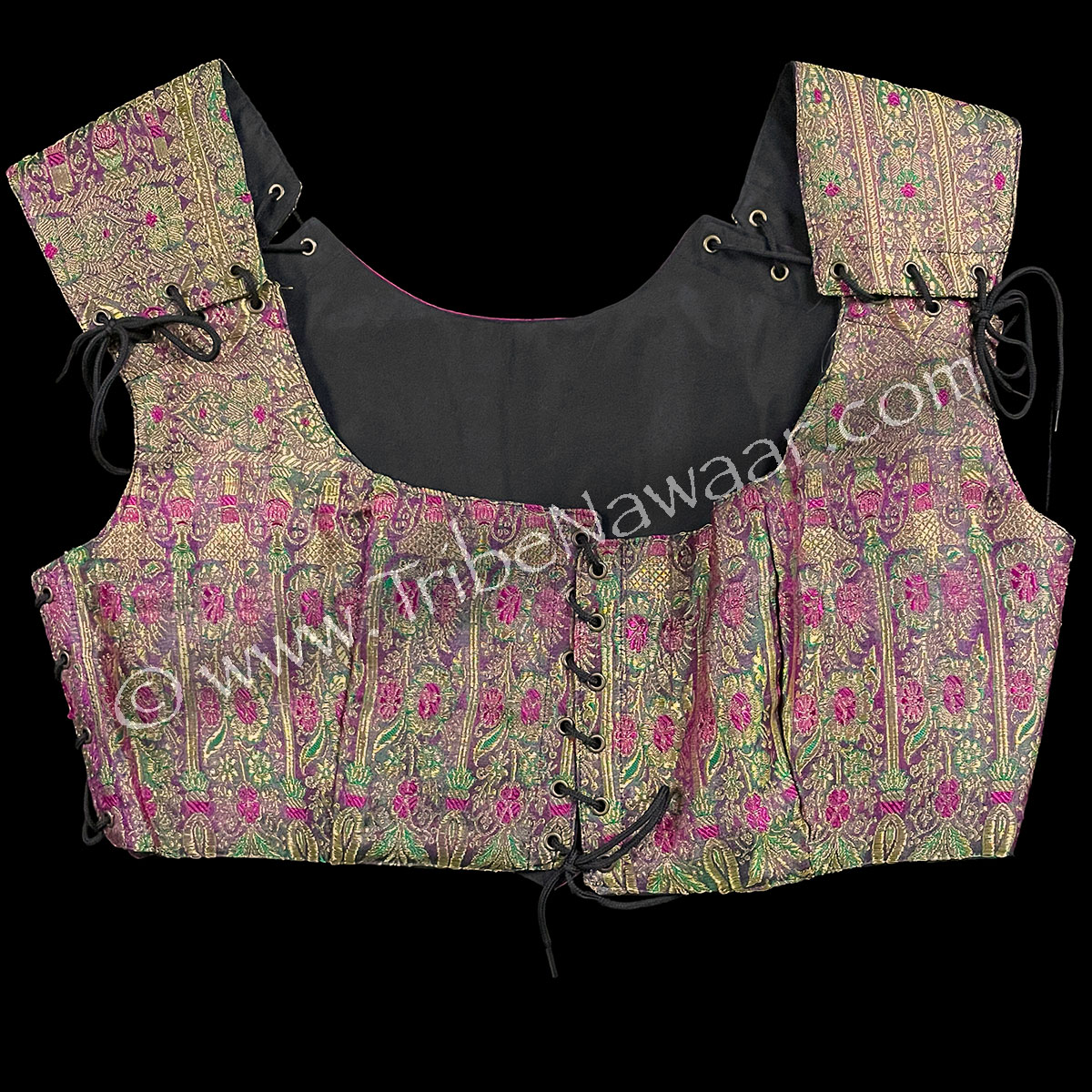 Our premium vintage sari fabric content is typically about 70% silk, 30% viscose. These up-cycled fabrics are cleaned, pressed and custom tailored into our fabulous one of a kind bodices. We’ve added a sturdy new lining to the inside of the bodice for maximum durability. Includes a bonus black lace tie just in case you loose one.