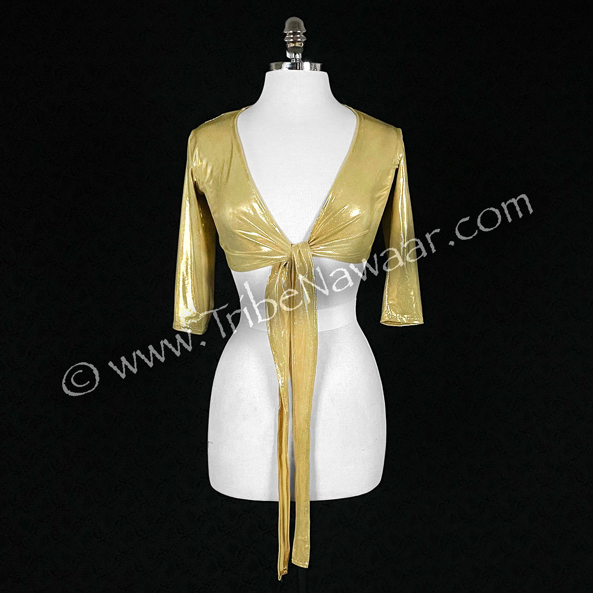 Gold lamé fabric sparkles under natural and stage lights. Wrap design features long ties and generous sizing to fit a large variety of sizes. Curve hugging fabric. Comfortable to wear too!