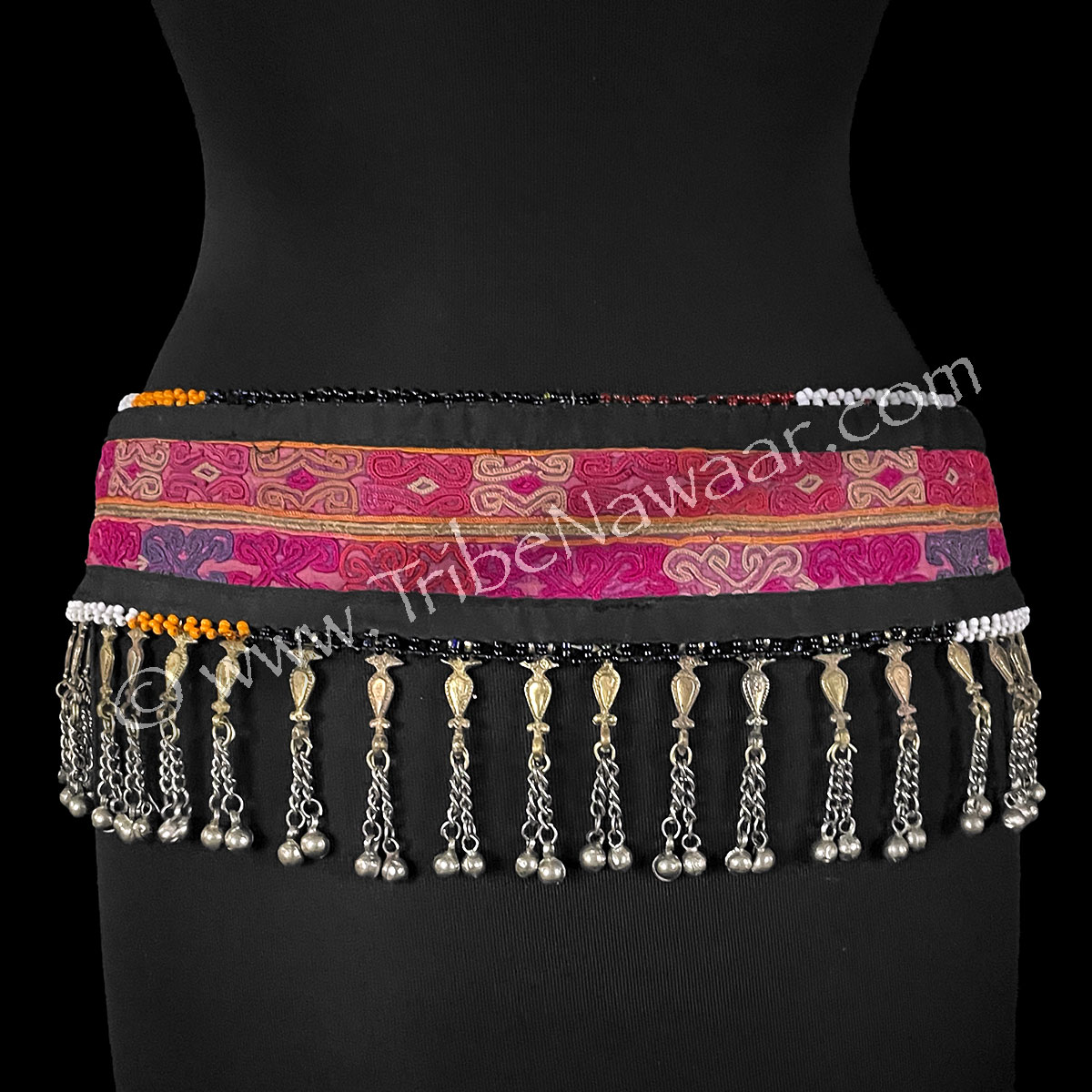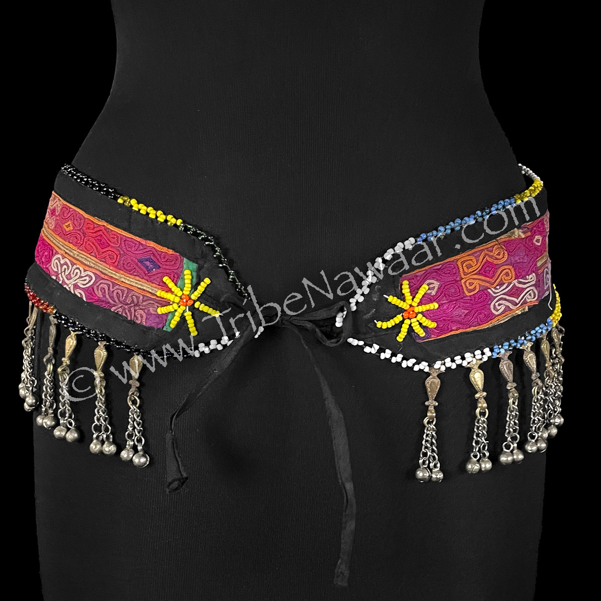 This belt features a black cotton base adorned with gota details in shades of rose, purple and more. Multicolored beads accent the top & bottom. Antique silver & gold tones in the metal work. Pendant falls accent movement with their melodic tone.