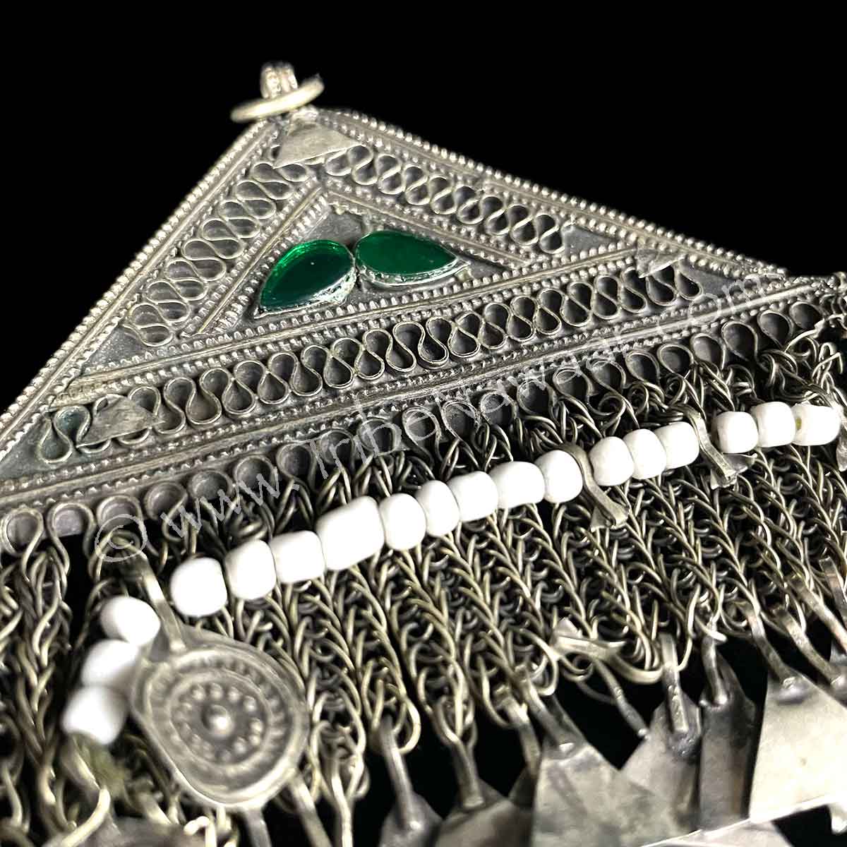 Vintage Afghan tribal jewelry from the Hazara artisans. Infinity scrollwork on body of pendant. Green teardrop & white bead accents. Dangles at bottom swing freely at the bottom and create a delicate, rain-like sound with movement. Loop on top allows you to easily add this to your jewelry or costume creations.