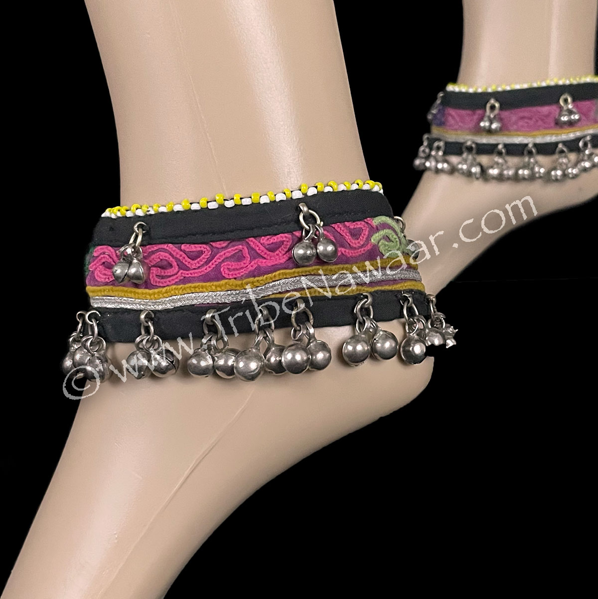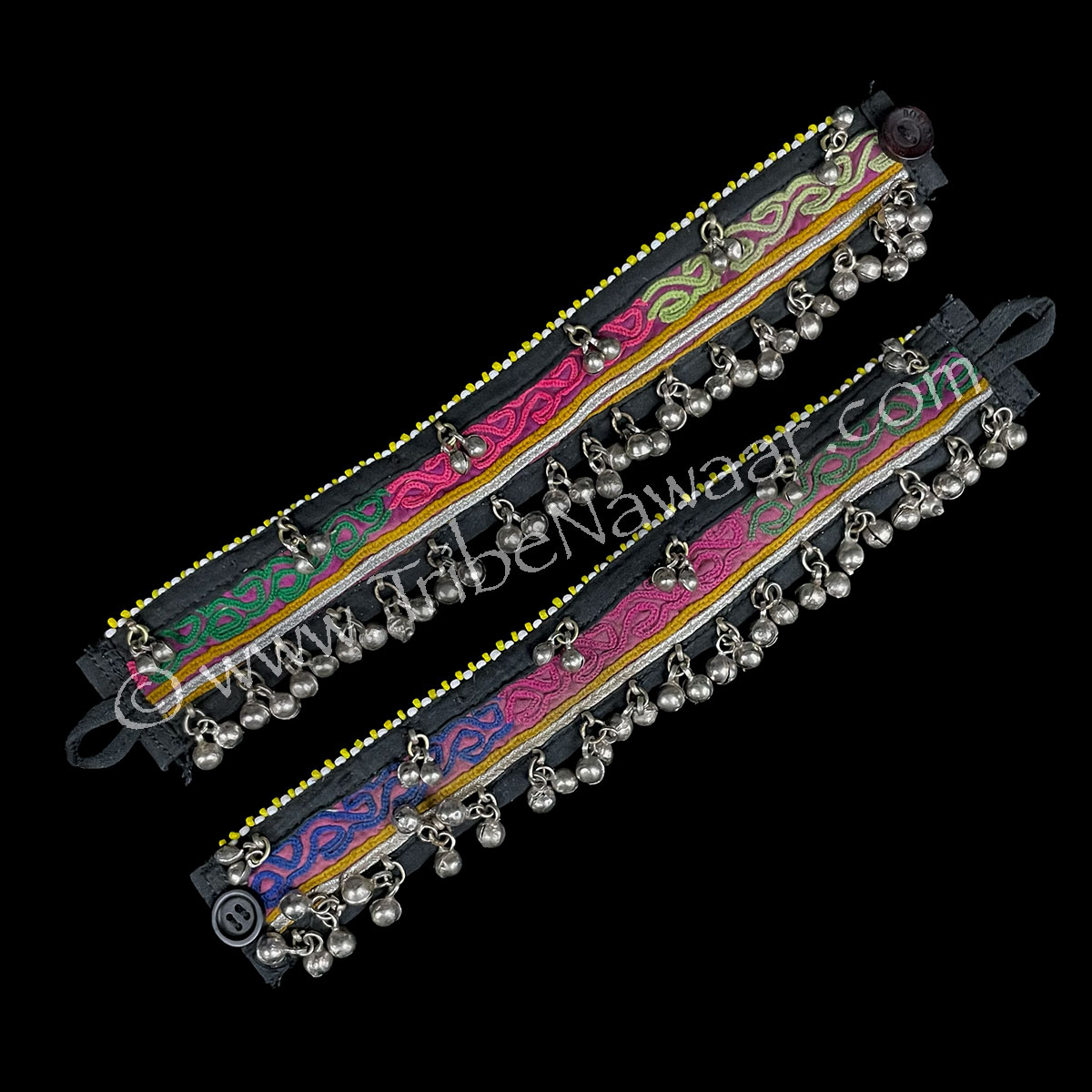 Our hidden garden traditional gota anklets feature a multicolored vintage Gota band with silver and saffron accents. Silver bells on top and bottom edge. Attached to a sturdy black cotton base these anklets are comfortable to wear, as well! Small white and yellow beads accent the top edge… or wear them upside down (with the larger amount of bells at the top) for a different look! The bells will cover the Gota base and give more of an all silver look to these anklets!