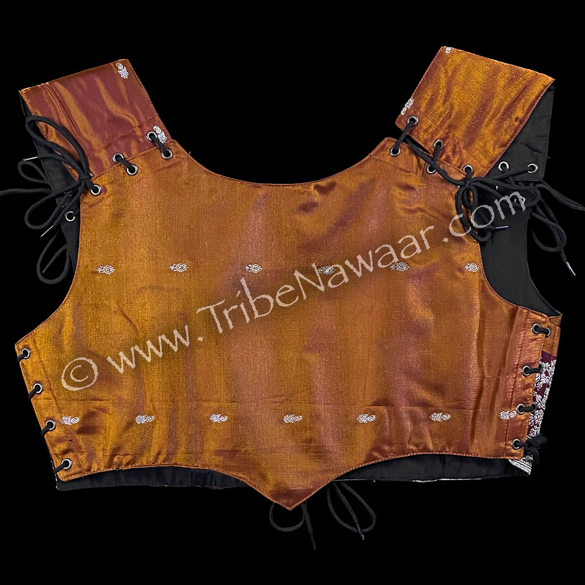 Eco-chic and environmentally-friendly, our Iridescent Copper bodice is newly constructed and assembled with vintage sari fabric in shades of color shifting copper. Champagne (silver-gold) and burgundy accents add interest. The inside is lined with sturdy new black cotton fabric.