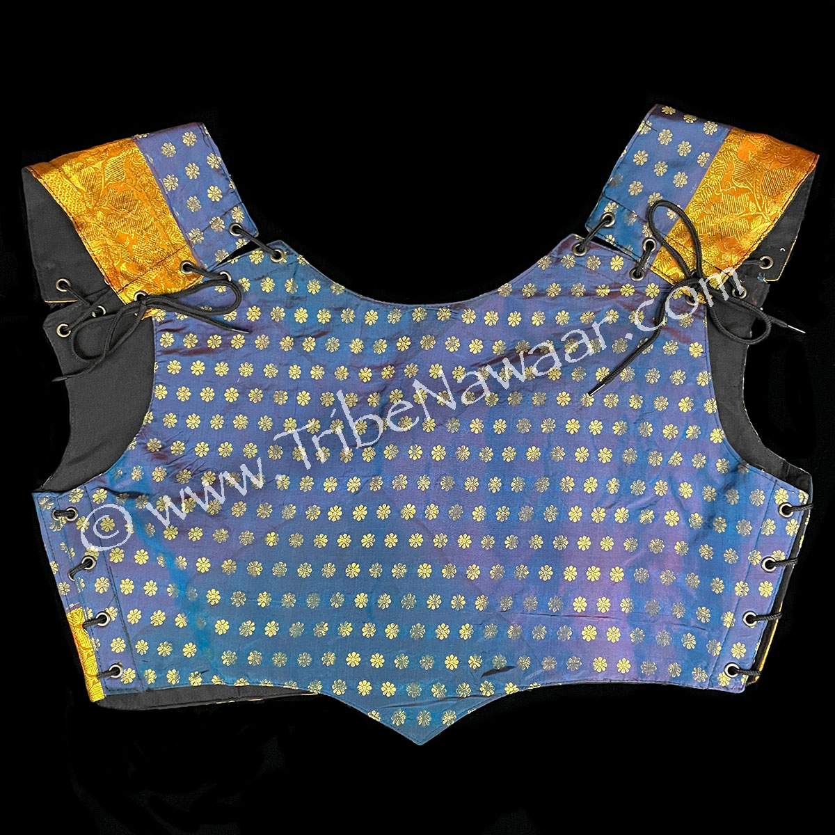 Eco-chic and environmentally-friendly, our Iridescent Iris bodice is newly constructed and assembled with vintage sari fabric in color shifting blue to violet. Accents of rich gold add interest. The inside is lined with sturdy new black cotton fabric.
