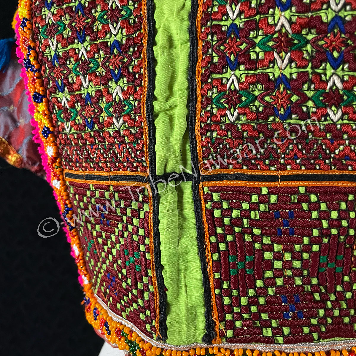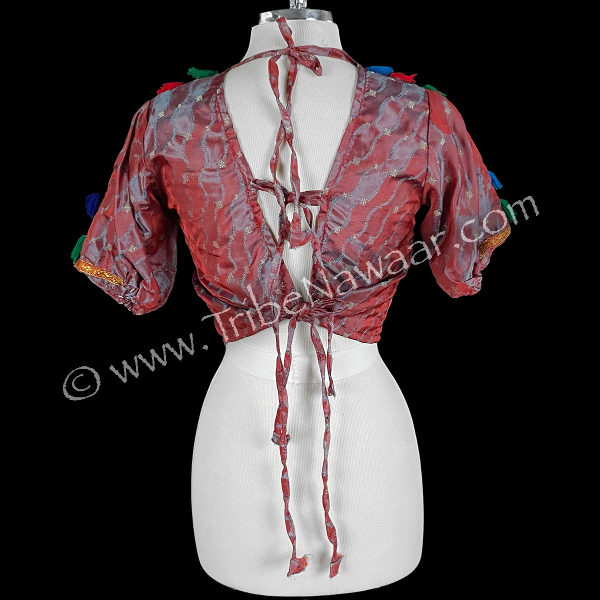Top is made with iridescent red & blue shifting fabric. Front features a vintage Banjara textile with elaborate embroidery and beadwork. Accented with multicolored poms on the shoulder and neckline. 3 ties at the back allow for adjustment in fit. A fresh alternative to the basic choli and coin bra combo!