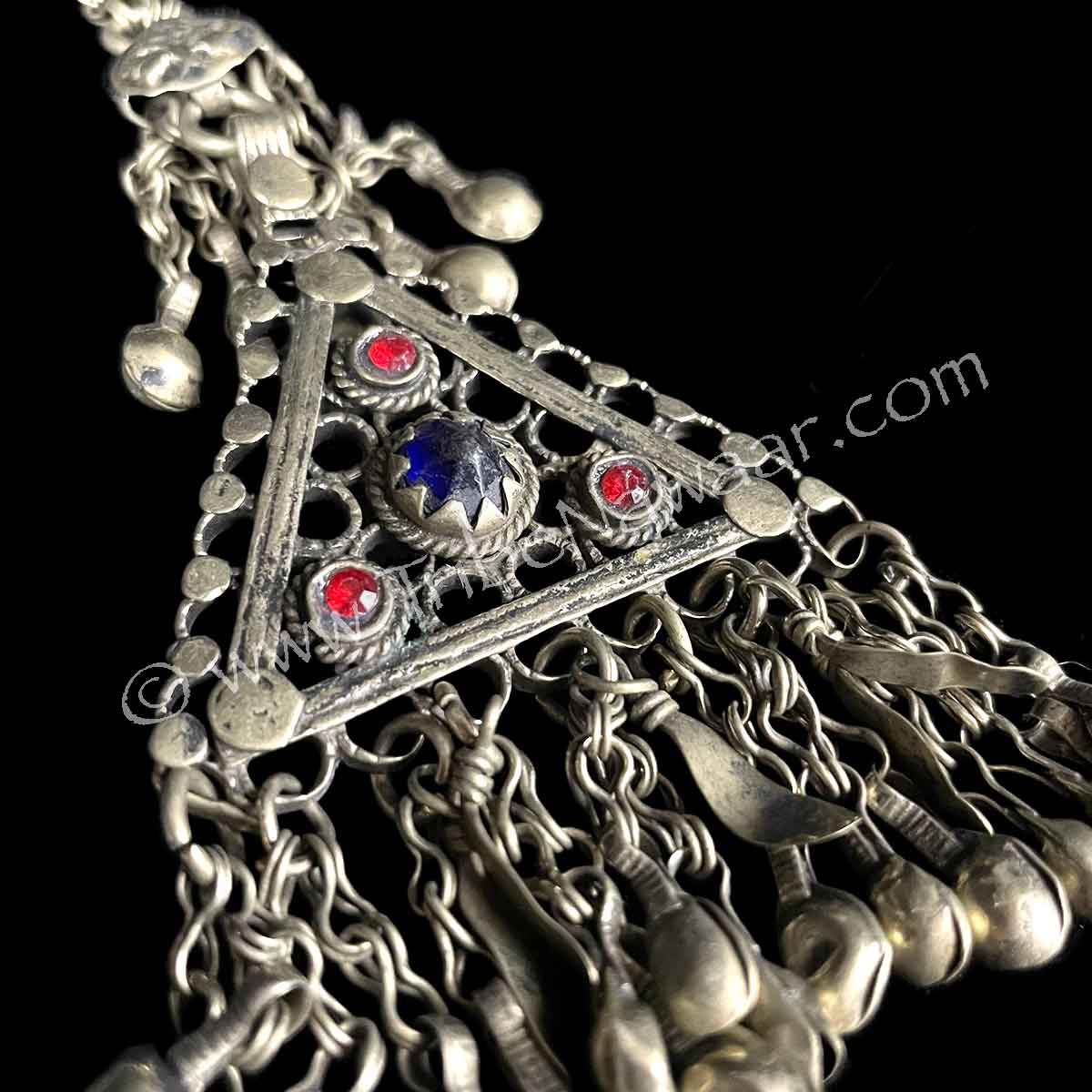 Rarer multi sectioned triangle shaped pendant. Center dangle above triangle pendant has the button back that shows how this piece used to fit into the button holes of a traditional garment. 3 long hand shaped bars at top add length and can be removed from jump ring and used separately, if desired.
