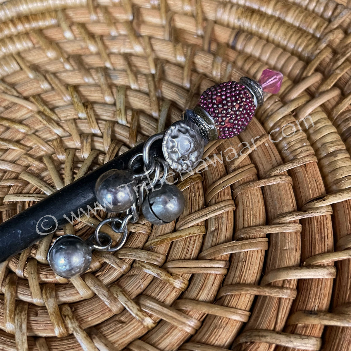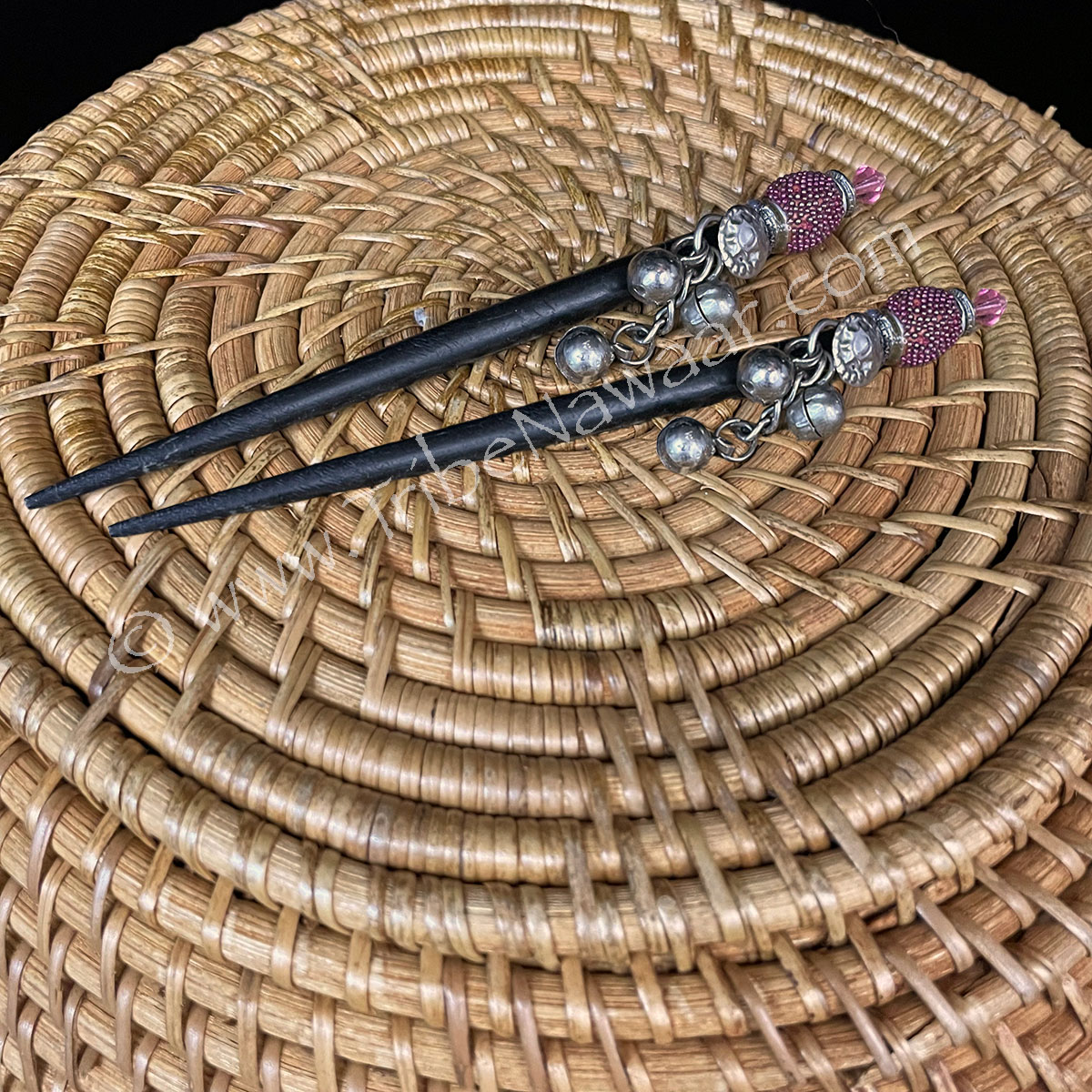 Black wood hair sticks with a smooth finish. Antique silver belled falls. Pink textured metal with crystal ends.