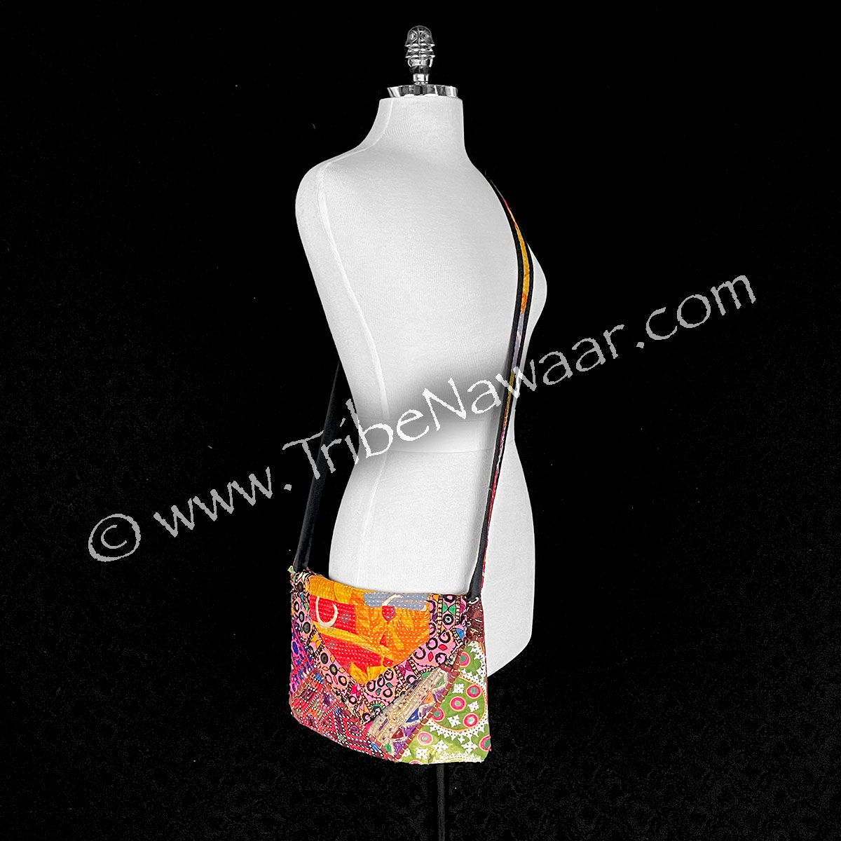 Laid flat the body of this purse measures 12″ wide and just under 9″ tall. Sturdy cloth shoulder strap is about 50″ in length. Easily can be worn across the body.