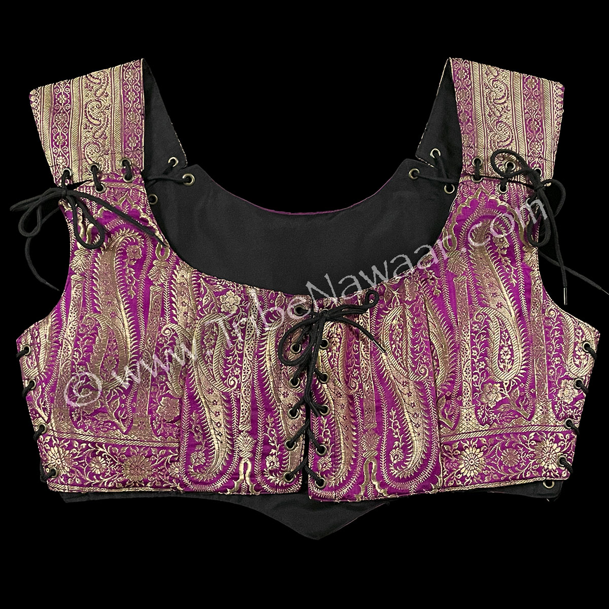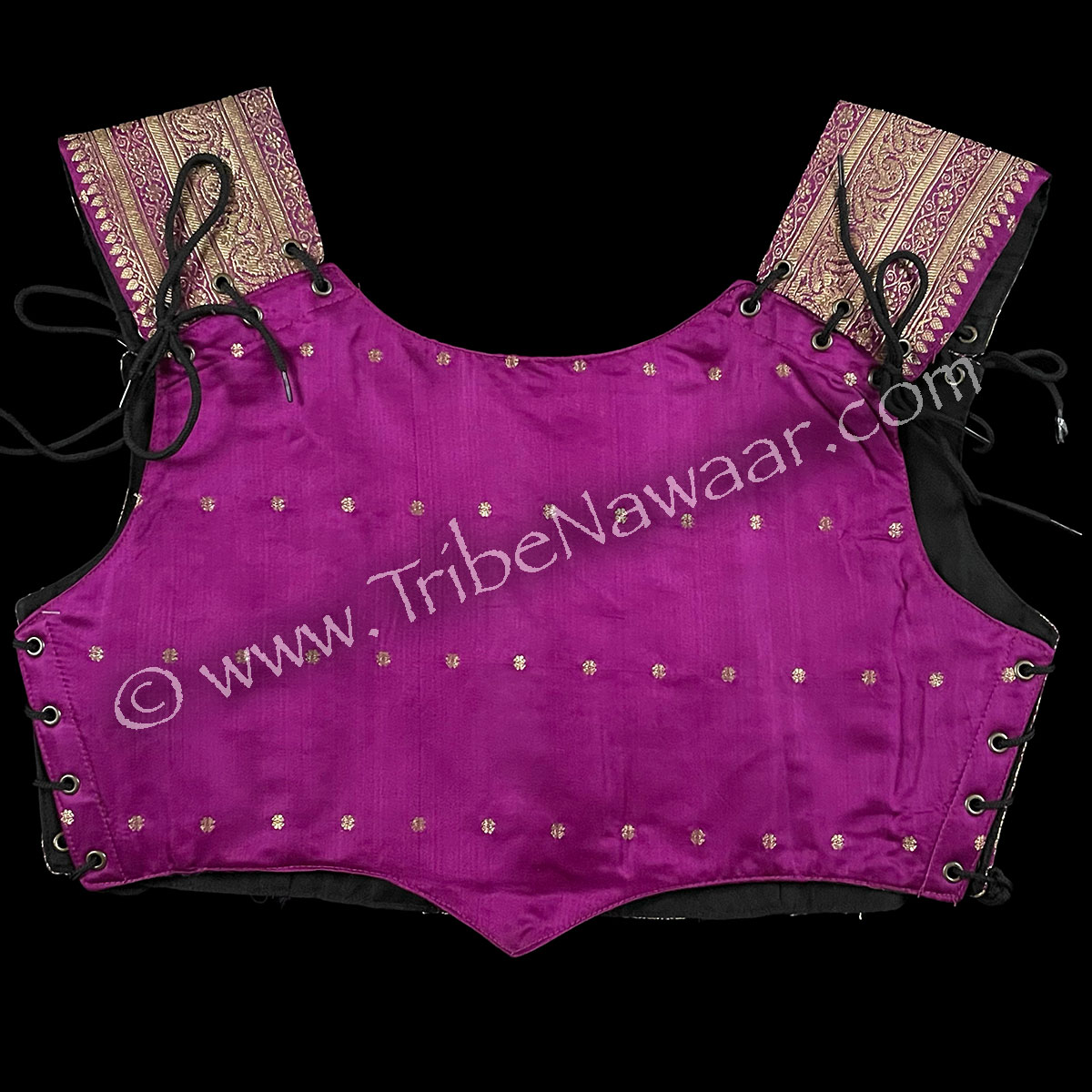 Eco-chic and environmentally-friendly, our Magnificent Magenta bodice is newly constructed and assembled with vintage sari fabric. The inside is lined with sturdy new black cotton fabric.