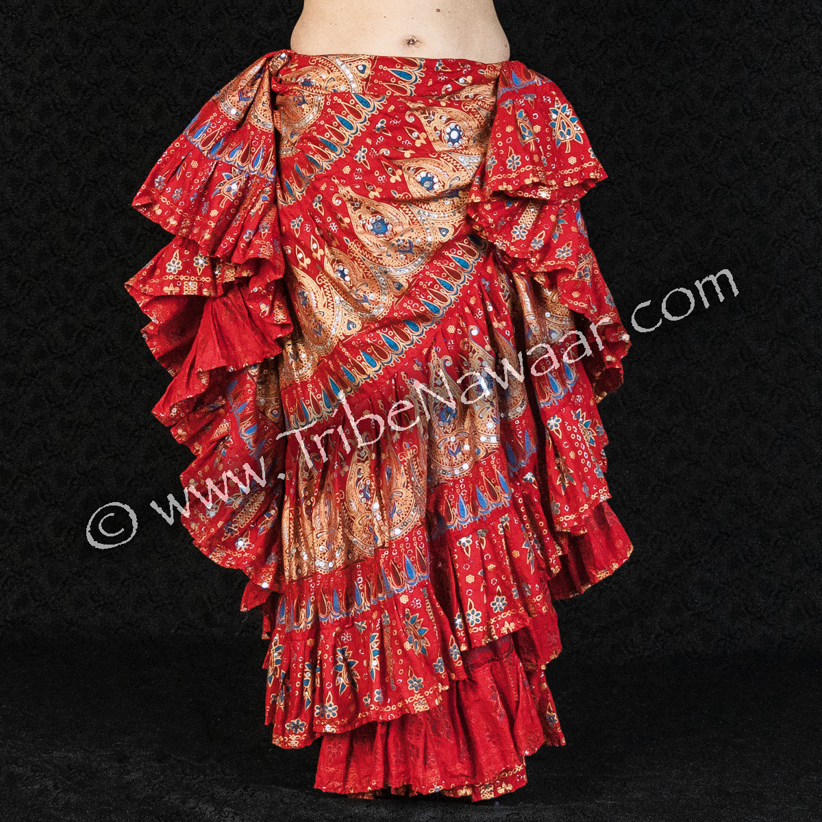 The glitter, sequins and mirrors are glued to the fabric to accentuate the fabric’s multicolored and detailed pattern. Some sequin and glitter loss is normal and should be expected. Mirrors have a larger surface area and are less likely to become dislodged, but, should be checked periodically, especially with vigorous skirt work.