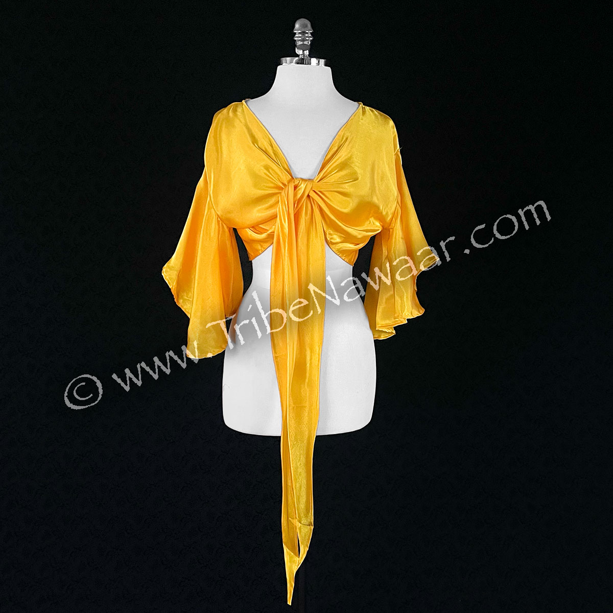 Warm yellow satin (tags say 100% cotton). Flowing bell sleeves. Wrap design features long ties and generous sizing to fit a large variety of sizes.