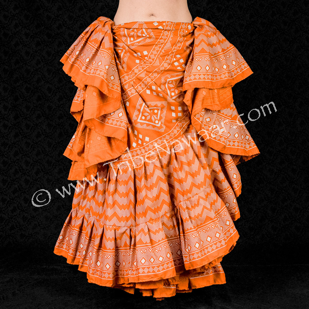 The traditional block printing on this skirt has a slight sparkle/sheen. The pattern is inspired by traditional Assuit fabric (also known as Tulle bi telli). The Assuit fabric have long been loved by belly dancers near and far and have been featured in classic Hollywood films, such as Cleopatra and Samson & Delilah.