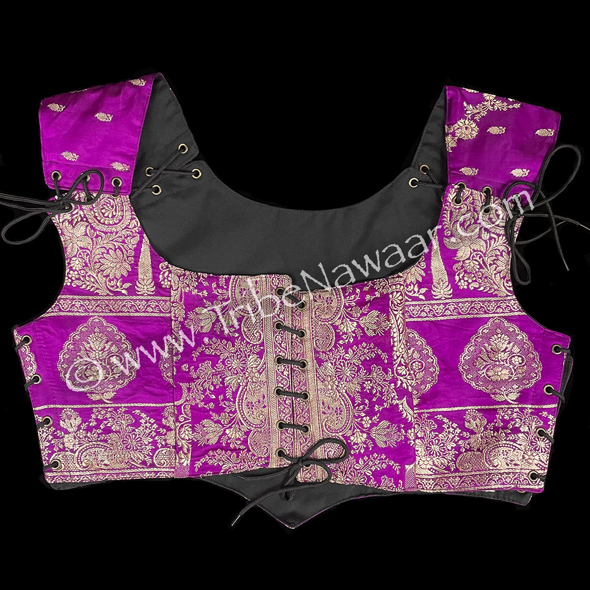Our premium vintage sari fabric content is typically about 70% silk, 30% viscose. These up-cycled fabrics are cleaned, pressed and custom tailored into our fabulous one of a kind bodices. We’ve added a sturdy new lining to the inside of the bodice for maximum durability. Includes a bonus black lace tie just in case you loose one.