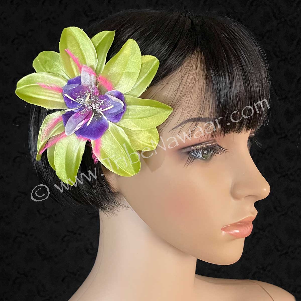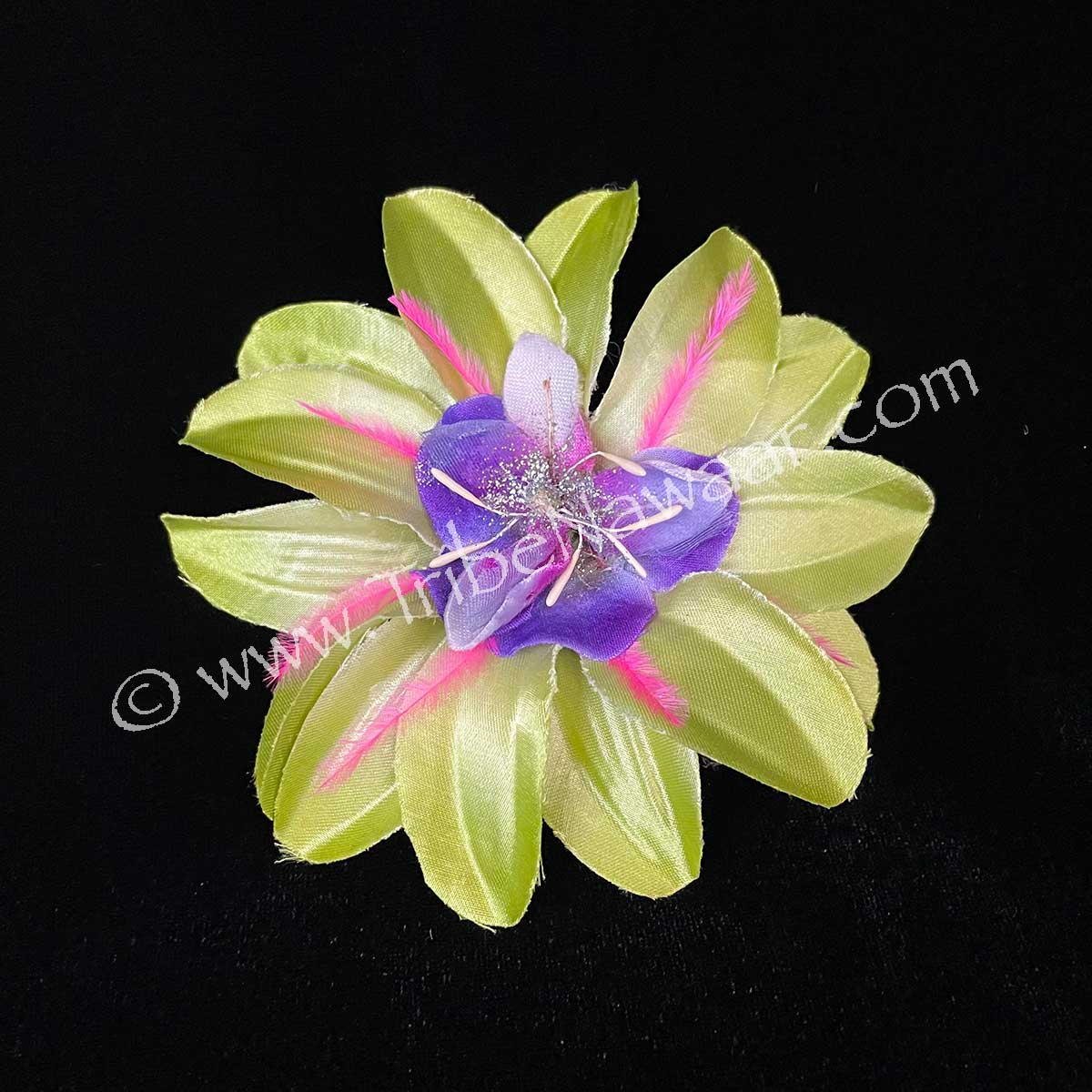 Silky bright green flower with purple and magenta center. Pink ostrich feathers accent movement. Silver sequins in the center add the finishing touches.