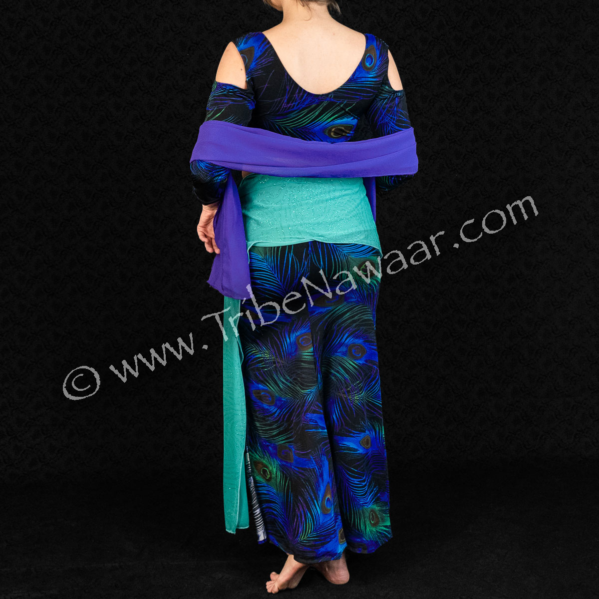 This Peacock Mermaid Skirt & Mock Wrap Top are great for both class or stage. Comfortable 4 way stretch. Teal & purple scarves are separate bonus pieces and can be worn around the hips, neck or tied in the hair. Off The Nile line from Dahlal International.