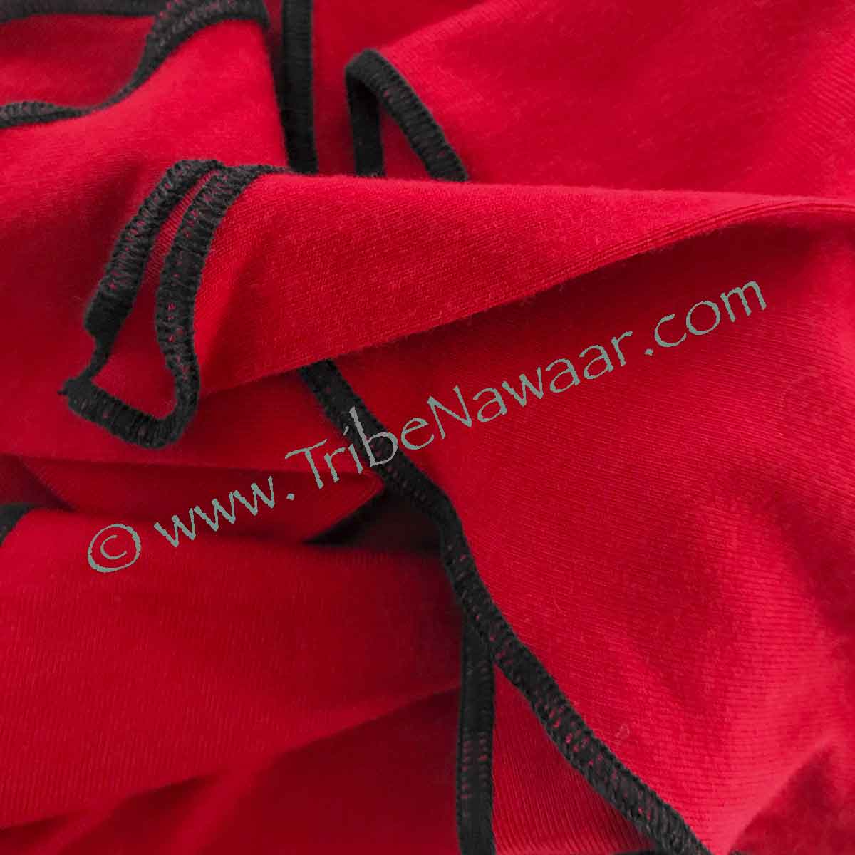 Super soft vibrant red toned rayon spandex fabric with black contrasting serged seams and a 3/4 sleeve.