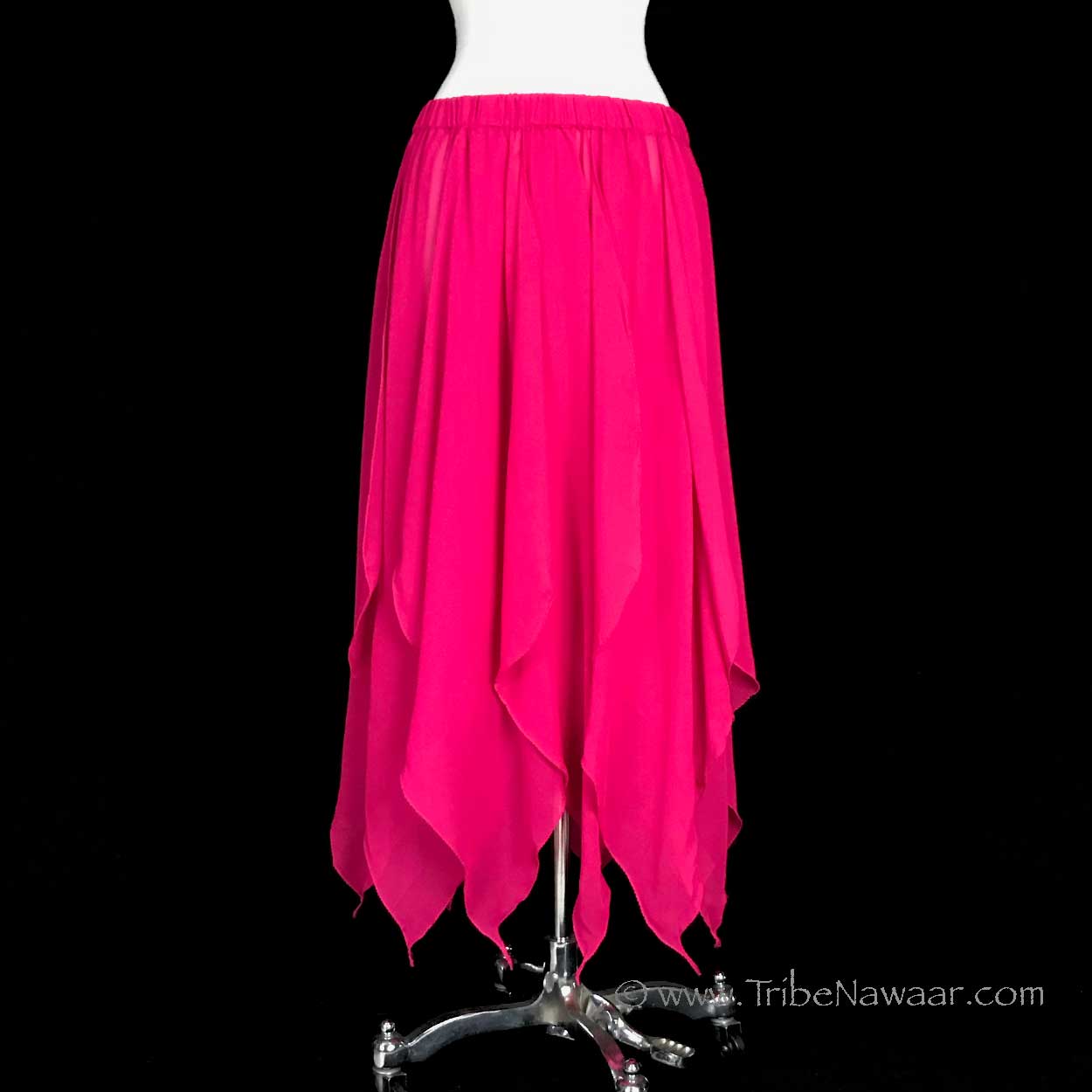 Our pink petal faerie skirt has petal shaped panels that flow and sway with movement. Each panel is attached at the waistband, so, there are nice high slits in this skirt to allow for full range of movement. You could even do the splits or high kicks.. this skirt won’t stop you. The gently flowing chiffon is great for accenting all those bellydance hip movements. Add any of our coin hip scarves as either a hip wrap or top wrap to create an instant affordable new bellydance costume.
