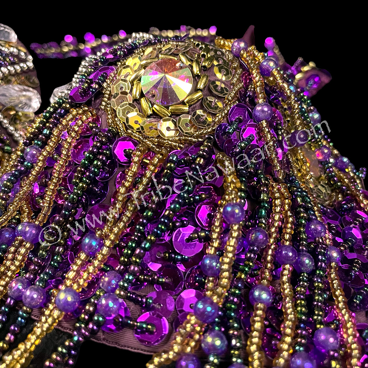 Bra is assembled over a mauve lingerie bra. Belt is on a soft flexible, satin lined base. All pieces showcase violet purple, gold & silver sequins and beads that sparkle and shine under stage and natural lighting.