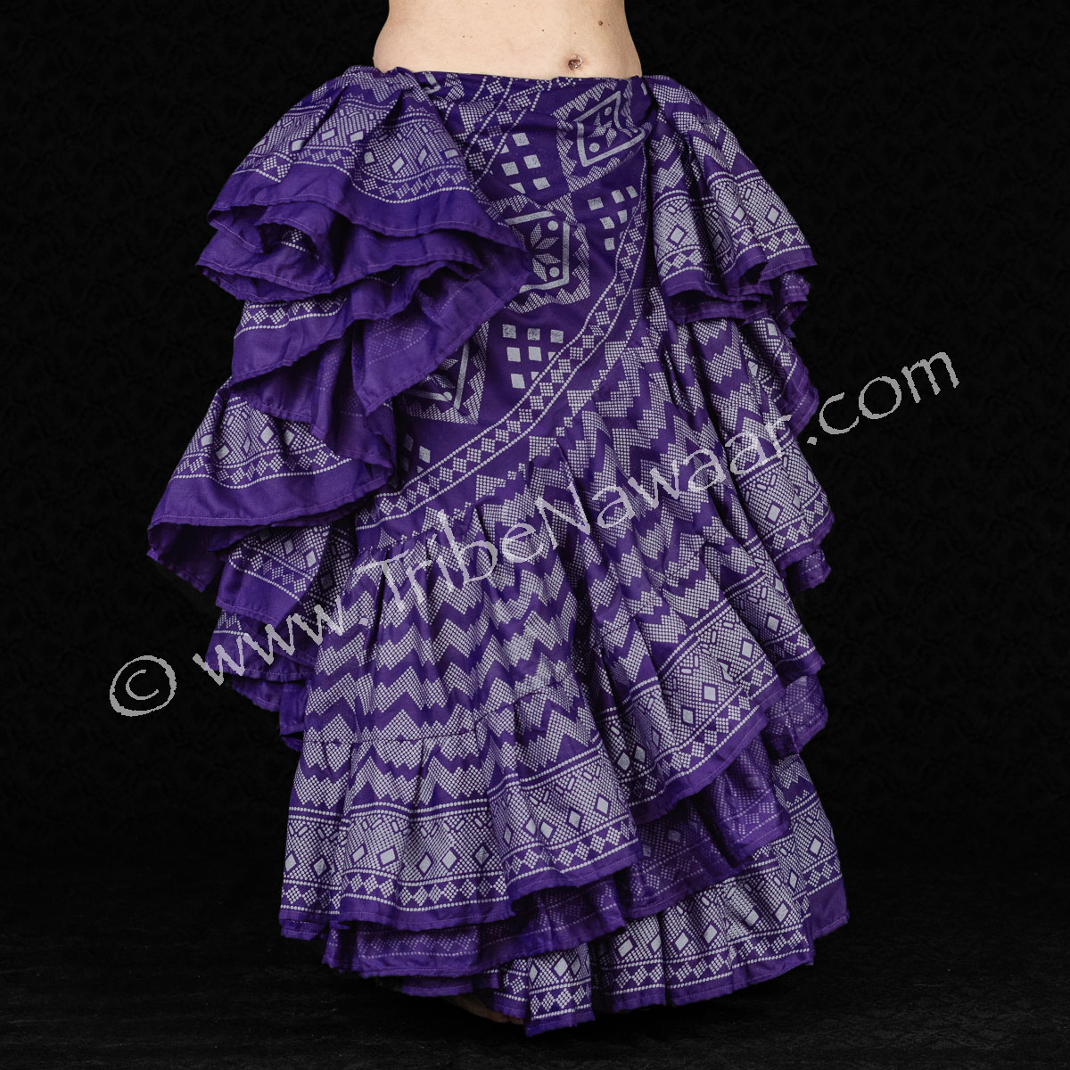 Our Purple & Silver Assuit Skirt features multiple tiers of decadent block printed fabric. You can see the original stamping of the block print process in the slight variations within each pattern. A true work of art!