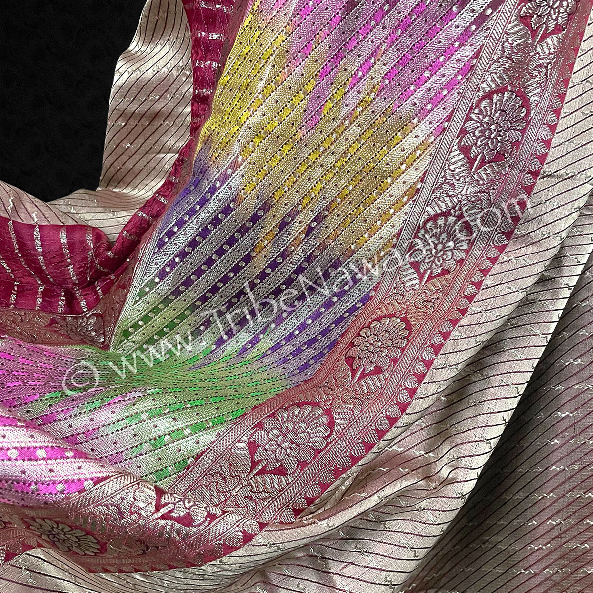 We start with a premium vintage fabric that is no longer being used as a traditional sari/saree. This is then cleaned, pressed and custom tailored into our fabulous one of a kind pants. Only the elastic and lining on the inside of the waistband are newly produced.