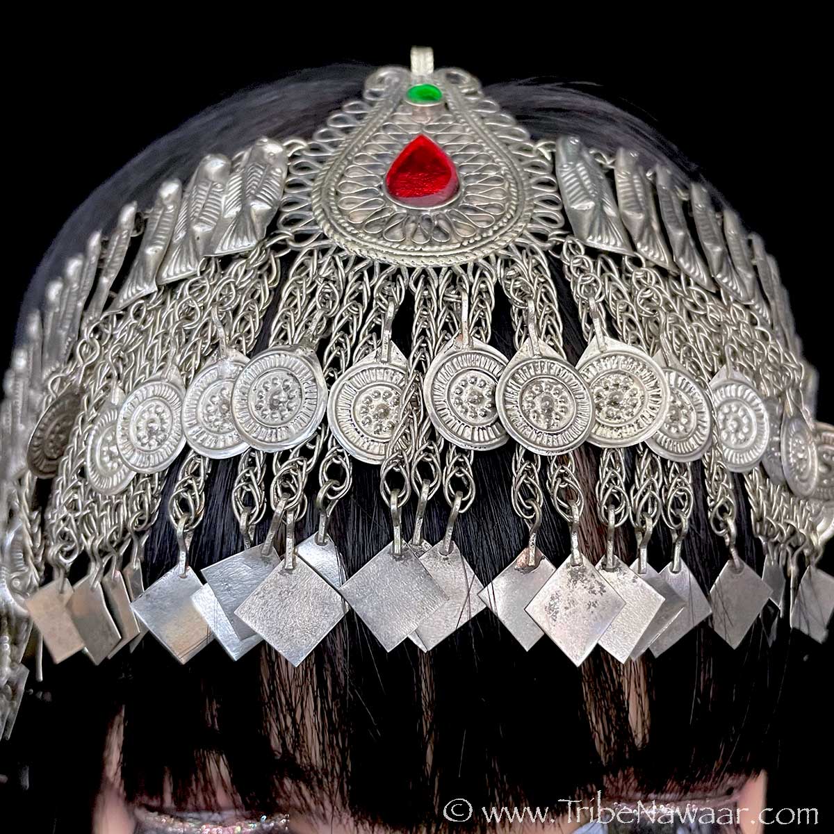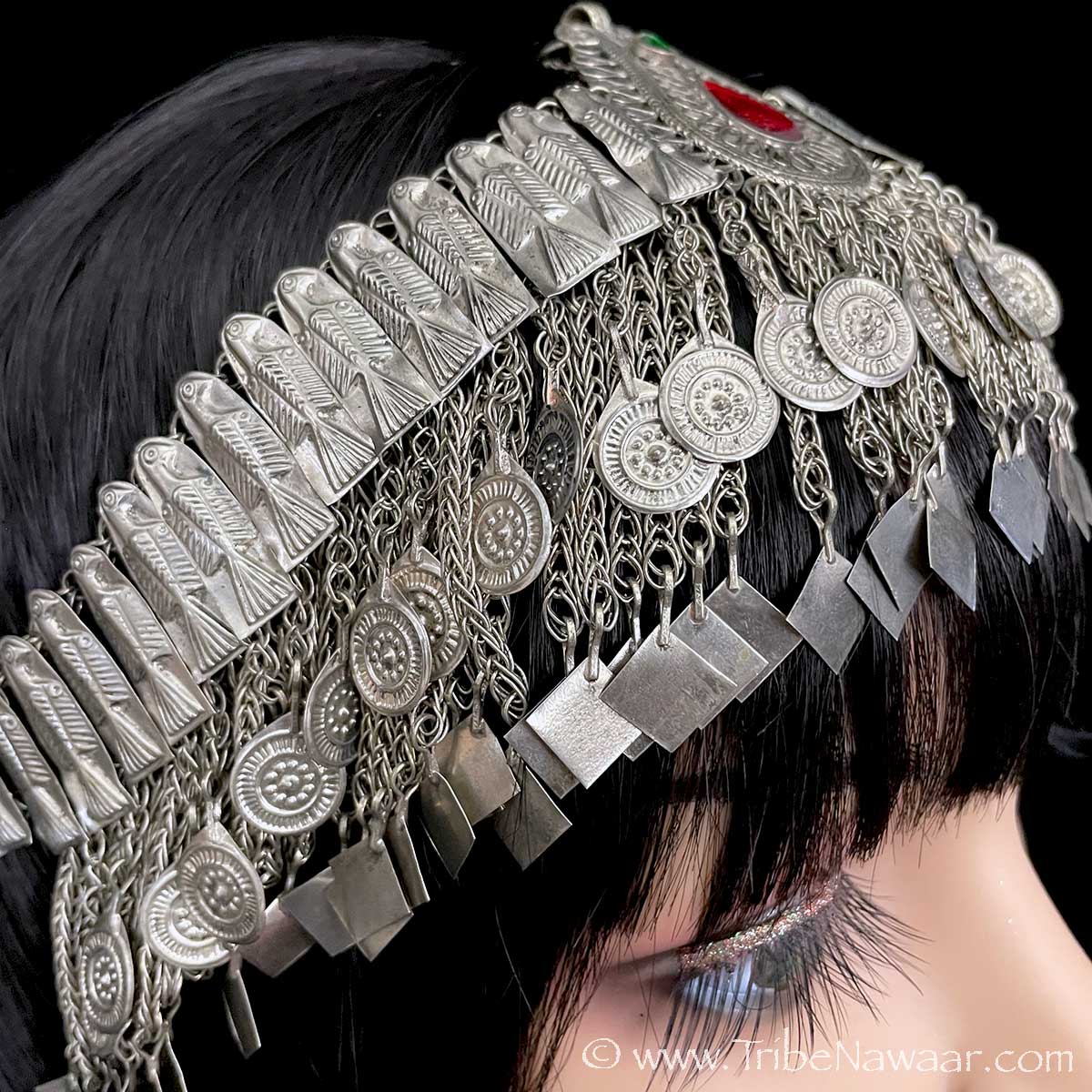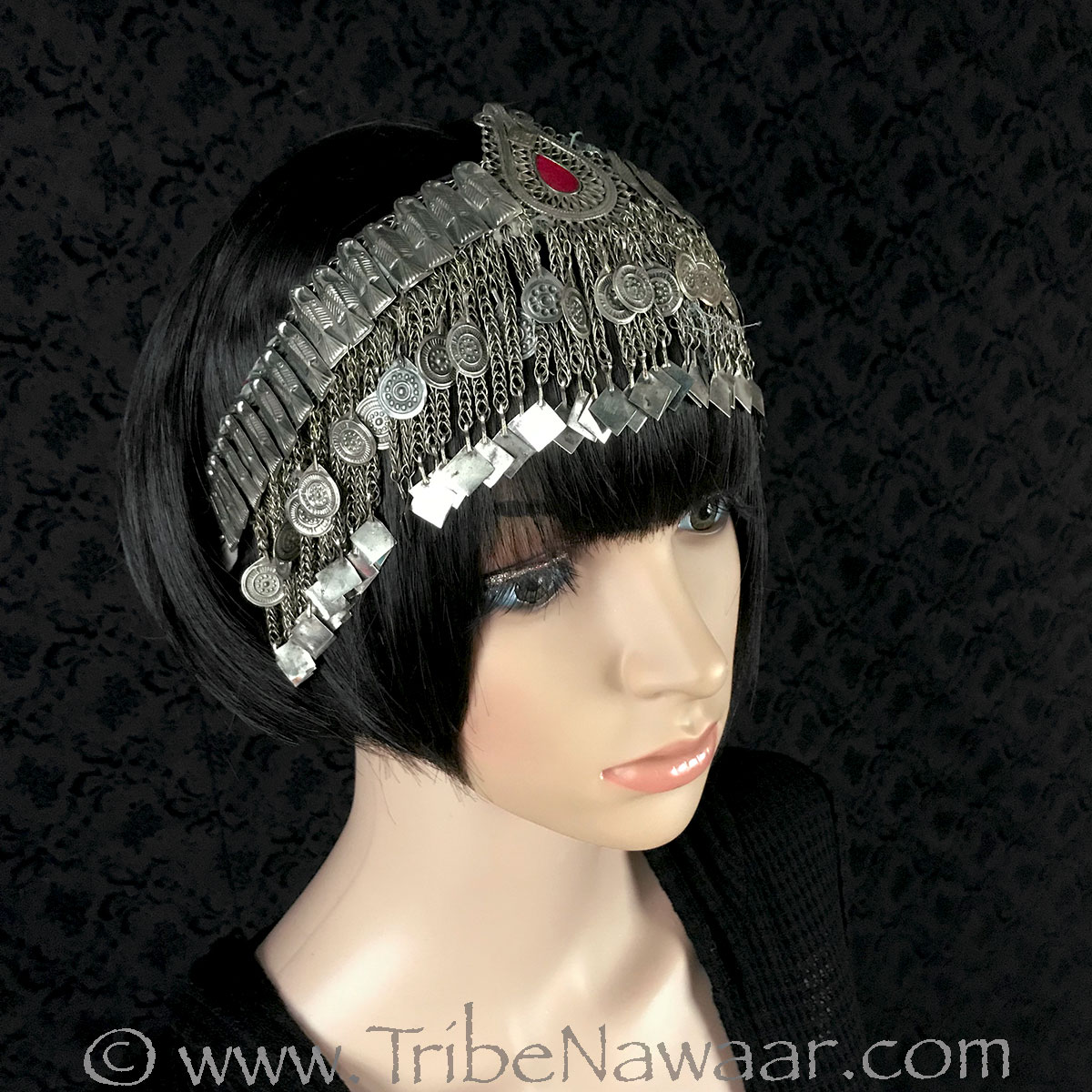 Our red & green HazarijJewelry is another gorgeous example of the jewelry pieces from the Hazara tribes of Afghanistan & Pakistan. These intricately crafted head jewelry pieces are curve hugging and very versatile. The are not only amazing as head pieces, they are also beautiful belly drapes, necklaces and add the finishing touches to head wraps. You can also pin them to choli tops for a quick and comfortable alternative to a coin bra!