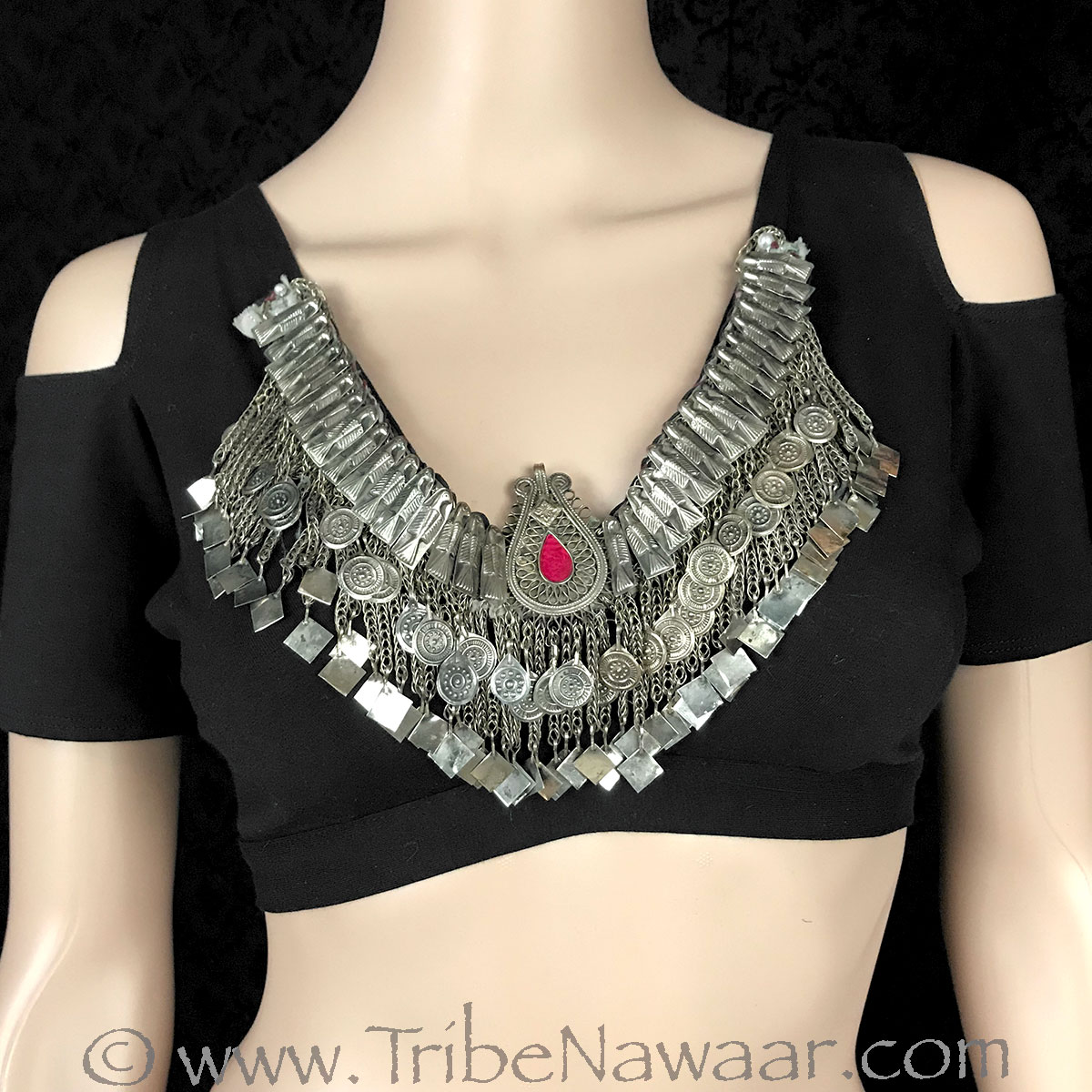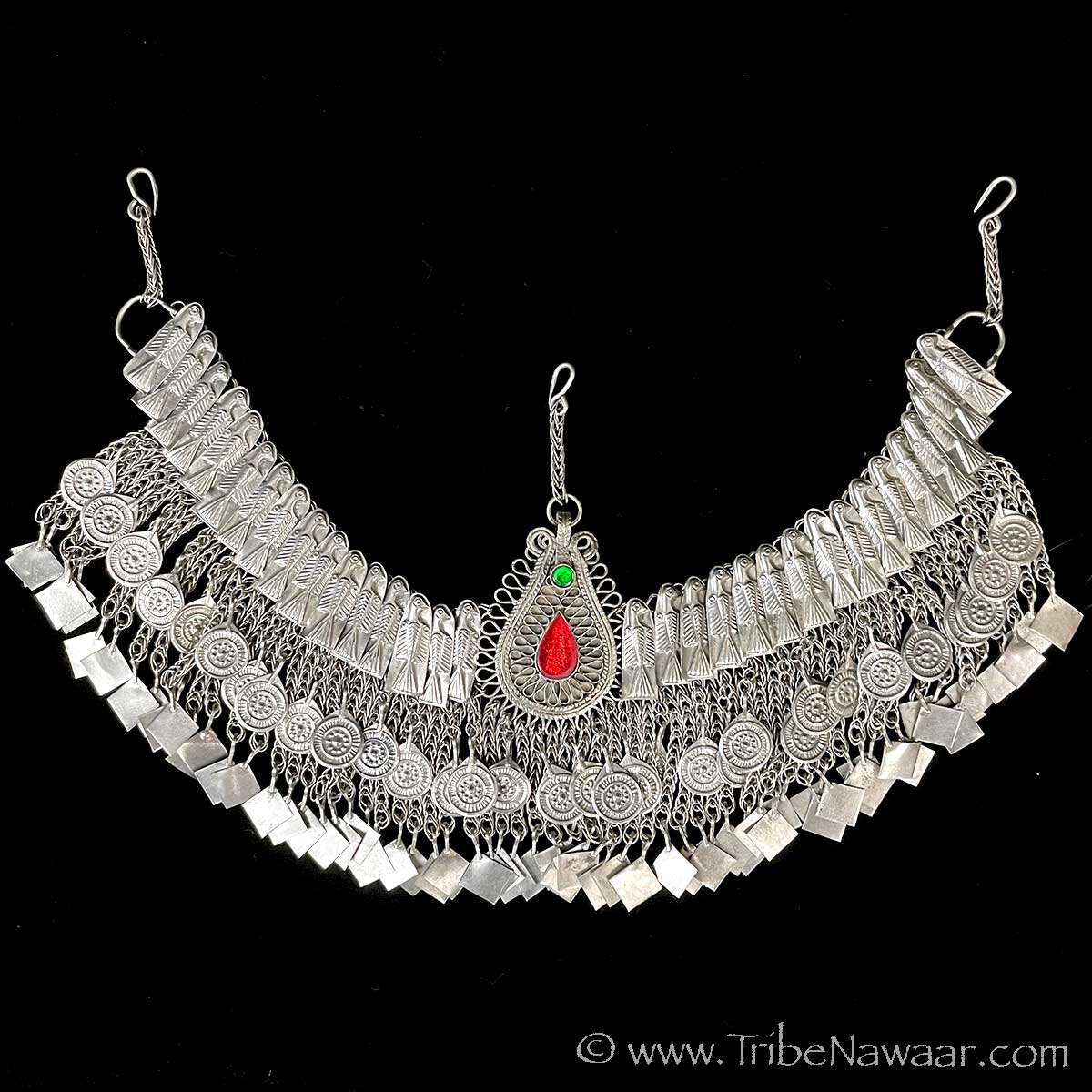 Traditional handiwork of the Hazara featuring embossed metal accents and delicate chain falls with a center accent pendant. Warm antique silver tones with a red center accent in the pendant set this piece off nicely.